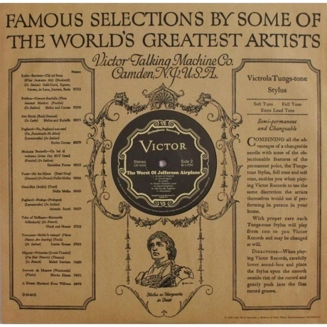 Переиздание на 180-граммовом виниле компиляции знаменитой американской рок-группы Jefferson Airplane The Worst Of Jefferson Airplane 1970 года.. The Worst of Jefferson Airplane — первый сборник американской рок-группы Jefferson Airplane, выпущенный в 1970 году на лейбле RCA Records. Выбор композиций для сборника примерно равномерно распределился между предыдущими пятью альбома группы. Исключением составляет «Plastic Fantastic Lover», живая композиция с единственного на тот момент концертника Bless Its Pointed Little Head.
