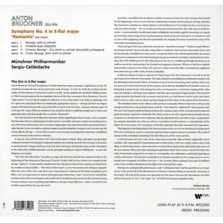 Симфония № 4 Антона Брукнера в исполнении Мюнхенского филармонического оркестра под управлением выдающегося дирижера Серджу Челибидаке. Серджу Челибидаке был, без сомнения, одним из самых важных и оригинальных дирижеров недавнего прошлого. Он был перфекционистом, которому не нравилось то, что он считал синтетическими звуками, создаваемыми в современной студии звукозаписи, предпочитая непосредственность концертной площадки и взаимодействие с живой аудиторией. Эта запись Брукнера отмечает выдающееся наследие его сотрудничества с Мюнхенским филармоническим оркестром, музыкальным руководителем которого он был с 1979 года до своей смерти в 1996 году. «Одно из величайших исполнений Брукнера, которое я когда-либо слышал - поистине выдающийся акт воссоздающего воображения (…). [Это исполнение] сосредоточено на игре на струнах удивительной глубины, красноречия и однородности. Как и в случае с Джулини, именно партии альта и виолончели, кажется, таят в себе самую душу музыки. Кантилены для альтов в медленной части (…) - вещи редкой красоты ». Gramophone