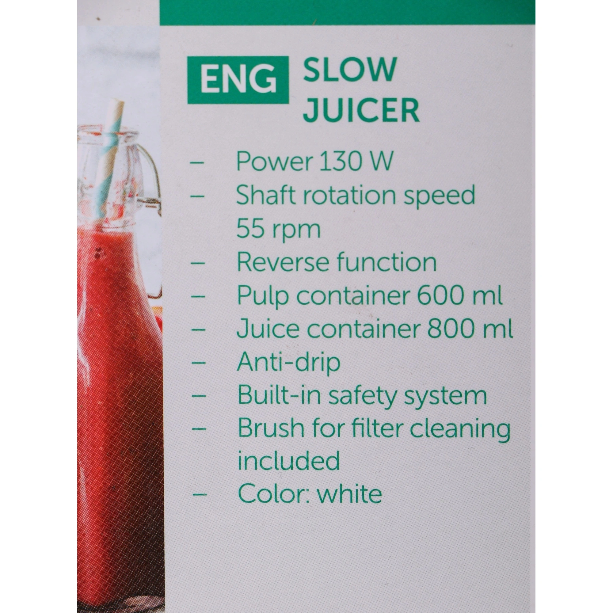 Scarlett SC-JE50S59 – прибор для приготовления натурального сока. Устройство выжимает сок при помощи шнека, позволяя извлечь максимум жидкости из фруктов, ягод, овощей и зелени. Соковыжималка работает на малых оборотах и не нагревает перерабатываемые продукты. Благодаря этому сок не окисляется и сохраняет все полезные свойства. В комплекте есть 2 резервуара – для сока (600 мл) и для жмыха (600 мл). Во время работы устройство не скользит по поверхности за счет прорезиненных ножек. Компактный размер прибора позволяет хранить его на столешнице для ежедневного использования.
