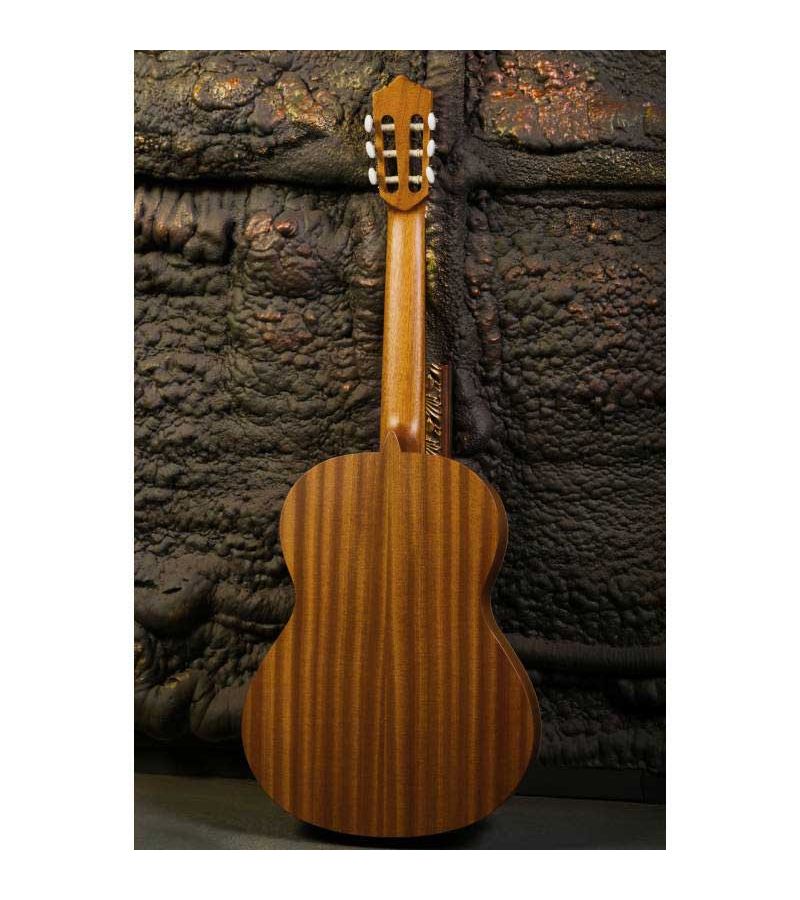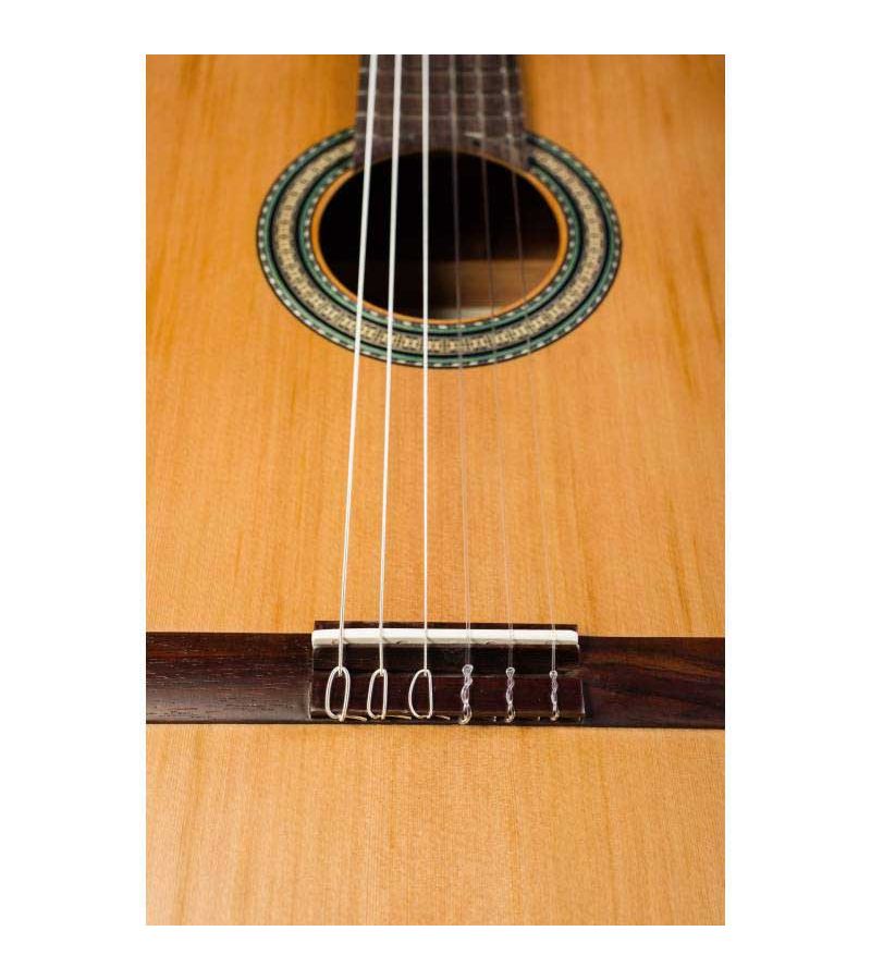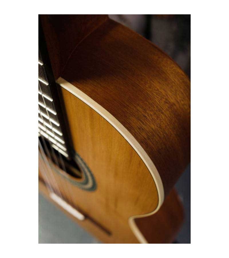 Верхняя дека гитары выполнена из массива кедра. Кедр (наряду с елью) - это традиционная древесина для изготовления качественных профессиональных инструментов. Кедр обладает мягким, глубоким звуком с огромным богатством обертонов. Корпус из красного дерева это так же признак качественного инструмента. Колковый механизм покрыт защитным никелевым покрытием. Эта гитара отлично подойдет для занятий в музыкальной школе и музыкальном училище, а также для игры дома.