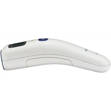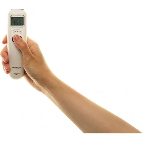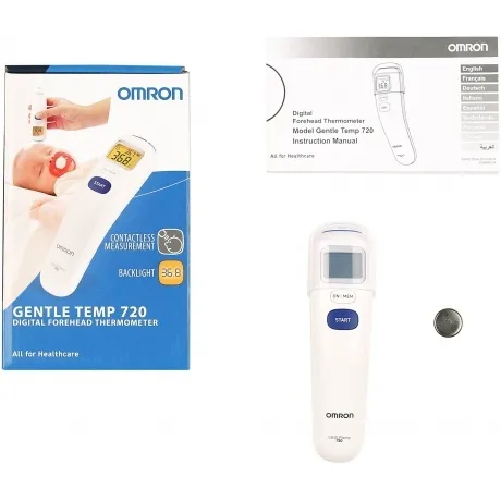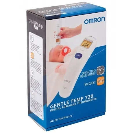 Инфракрасный лобный термометр Omron Gentle Temp 720, модель MC-720-E, - это электронный прибор, который предназначен для мгновенного измерения температуры тела на поверхности лба у детей и взрослых. Термометр Omron Gentle Temp 720 можно использовать для измерения температуры поверхности объектов, например, детского питания. Принцип действия прибора. Термометр улавливает в измеряемой точке инфракрасное излучение с поверхности лба, а затем рассчитывает значение, эквивалентное значению температуры при оральном измерении, используя уникальный алгоритм, основанный на выборочных данных исследования реальной температуры тела. Для определения температуры поверхности и комнатной температуры прибор измеряет инфракрасное излучение, исходящее от воздуха или поверхности. Прибор обеспечивает высокую эффективность измерения температуры тела, в сочетании с простотой использования. Измерение температуры на лбу не требует телесной фиксации термометра, поэтому показатели измерений обычно ниже, чем при подмышечном или оральном измерениях. Тем не менее, так как на лбу расположены кровеносные сосуды, которые намного меньше подвержены сужению (естественная функция выравнивания температуры тела), считается, что эта область лучше всего подходит для определения внутренней температуры тела. Прибор может показывать температуру в градусах Цельсия и Фаренгейта, управляется одной кнопкой и самостоятельно отключается после 1 минуты бездействия. Звуковой сигнал сообщит об окончании измерения. Для считывания показателей измерений в темноте (в больничной палате или в комнате ребенка в ночное время) термометр обладает функцией подсветки.