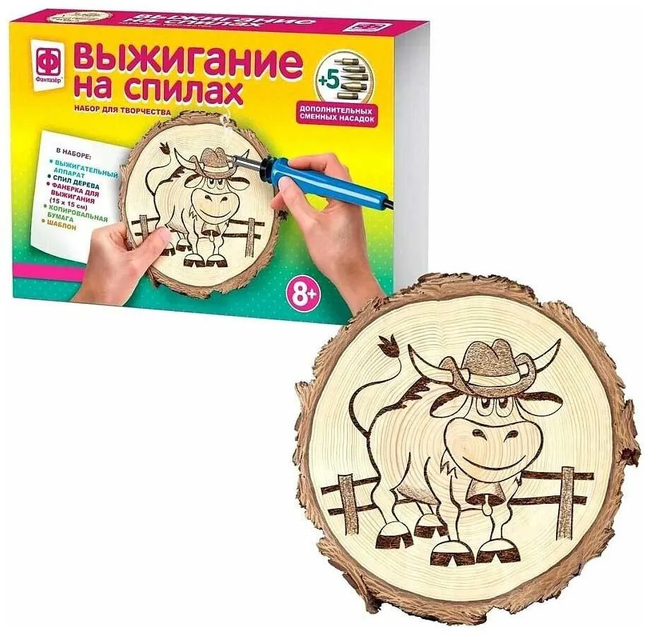 Теперь не нужно думать, как сделать линии более тонкими, где найти подходящий материал для будущей картины все в этой коробке, Во-первых, это удобный современный выжигательный аппарат с 6 сменными насадками, чтобы вам было легче сотворить именно то, что вы задумали. Во-вторых, это два листа фанеры: один с уже нанесенным сюжетом будущего рисунка, а второй чистый. Потренируйтесь и приступайте к созданию своего уникального панно, экспериментируйте, открывайте новые грани творчества. А тот результат, которого вы добьетесь с этим набором, будет прекрасным подарком родственникам и друзьям ведь это ваше творчество, в которое вы вложили частичку себя.