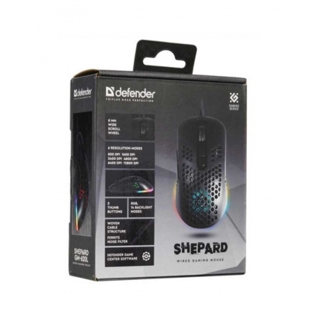 Мышь проводная Defender Shepard GM-620L – это надежный игровой манипулятор для компьютера или ноутбука. Устройство способно решить подавляющее большинство геймерских задач благодаря высокопроизводительному оптическому светодиодному сенсору, максимальное разрешение которого достигает 12800 dpi. Модель Defender Shepard GM-620L получила элегантную черную расцветку корпуса и эффектную RGB-подсветку. Манипулятор с эргономичной формой корпуса подходит для использования правой рукой. Надежный хват без риска проскальзывания мыши в руке обеспечивает корпус из пластика с матовым покрытием.