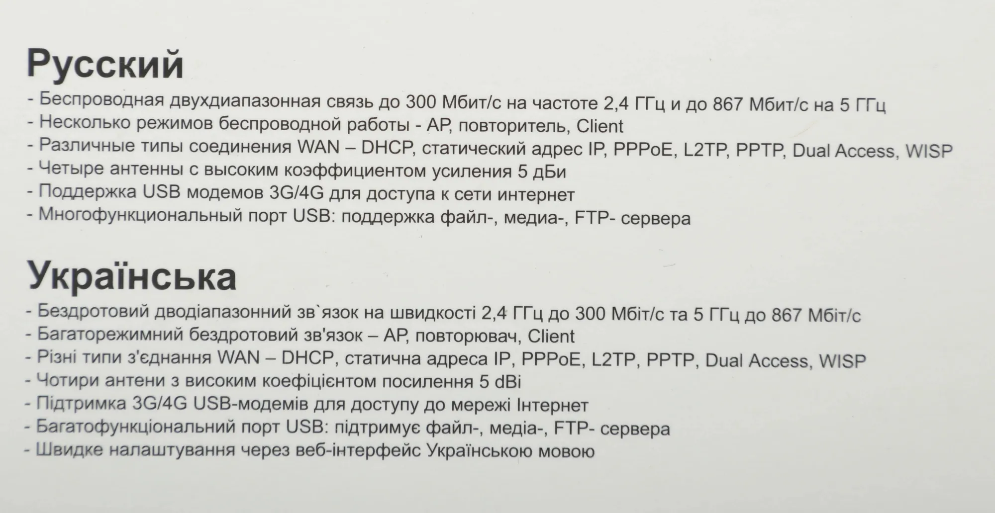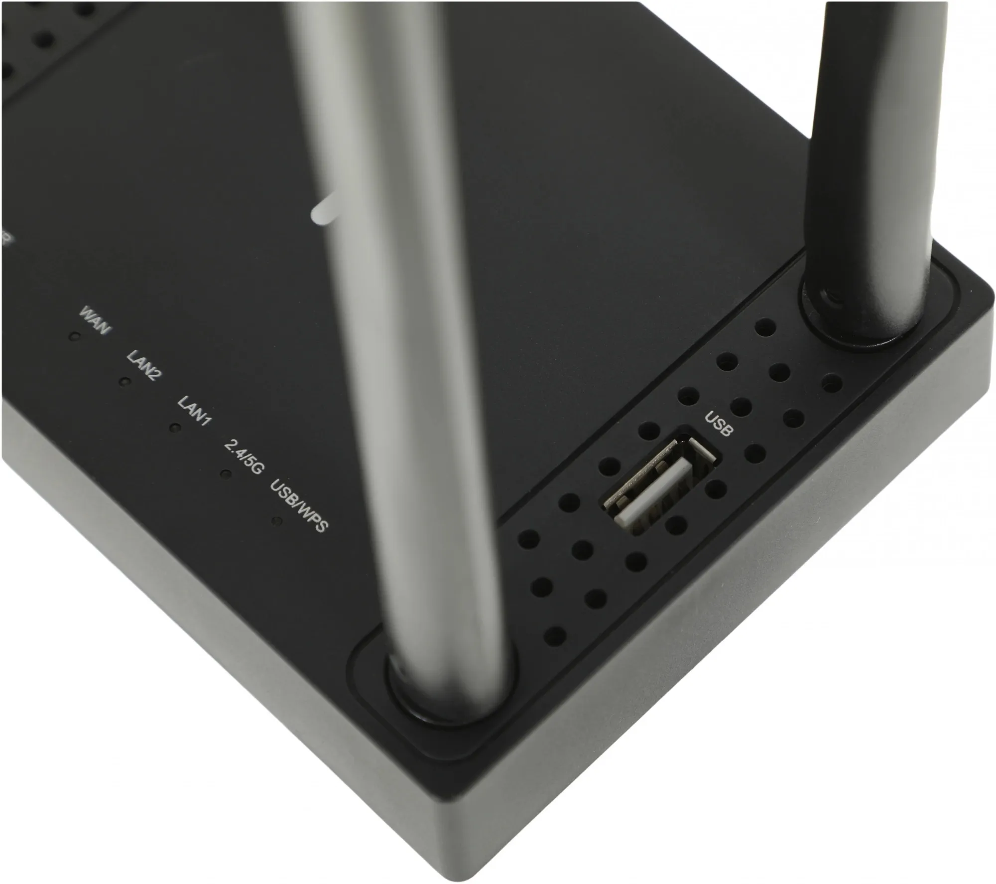 Беспроводной маршрутизатор NETIS N5 поддерживает оба диапазона Wi-Fi – 2.4 и 5 ГГц. Наибольшая скорость на частоте 2.4 ГГц равна 300 Мбит/с, а на частоте 5 ГГц – 867 Мбит/с. Есть возможность использования двух диапазонов одновременно. Роутер NETIS N5 поддерживает TR-069, а так же IPv6. За счет 2 портов LAN со скоростью передачи данных до 100 МБит/сек маршрутизатор NETIS N5 обеспечивает подключение к Интернету по кабельному каналу до 2 ПК или других стационарных устройств. Допускается подключение устройств через USB 3G/4G-модем.