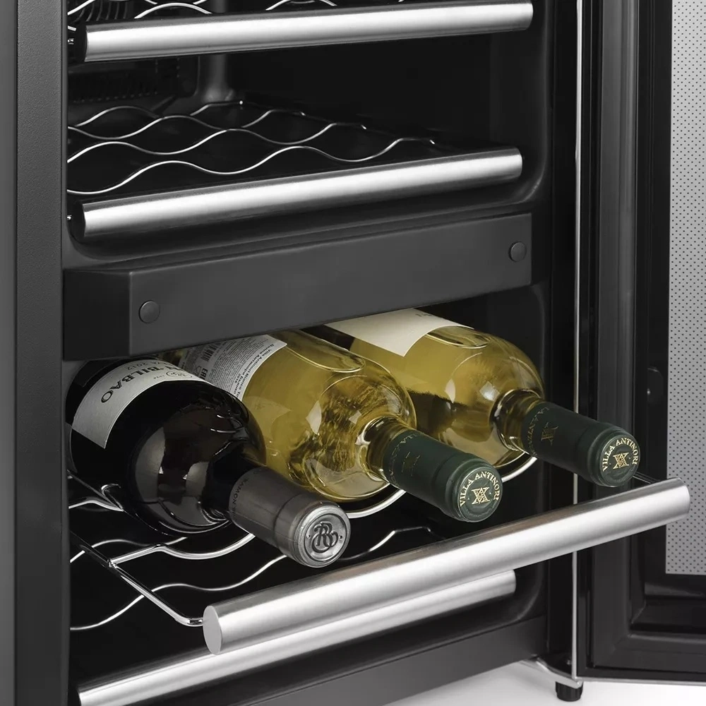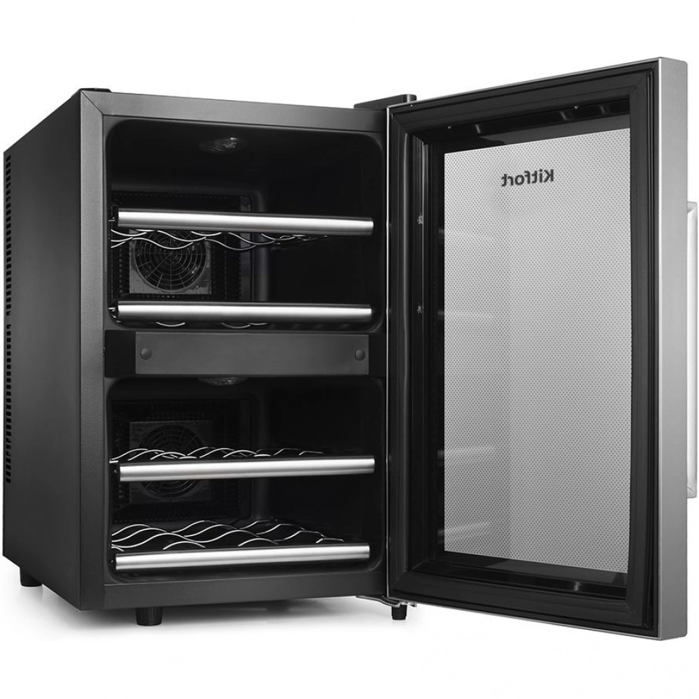 Важной особенностью винного шкафа Kitfort КТ-2405 является наличие двух климатических зон, в которых можно хранить разные сорта вина при разной температуре. Винный шкаф оборудован четырьмя надёжными металлическими полками. Дверца шкафа из тонированного стекла не пропускает УФ-излучение, что исключает вероятность окисления вина.