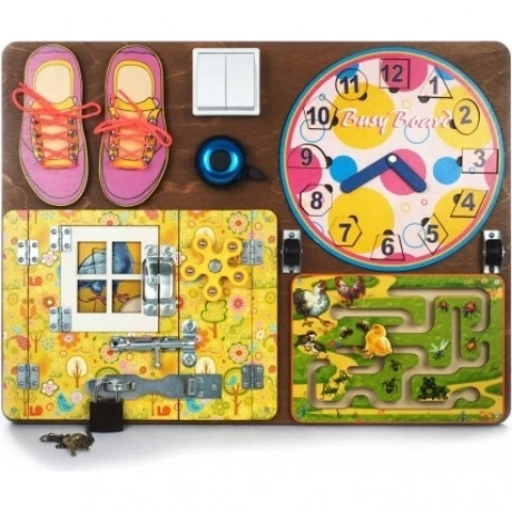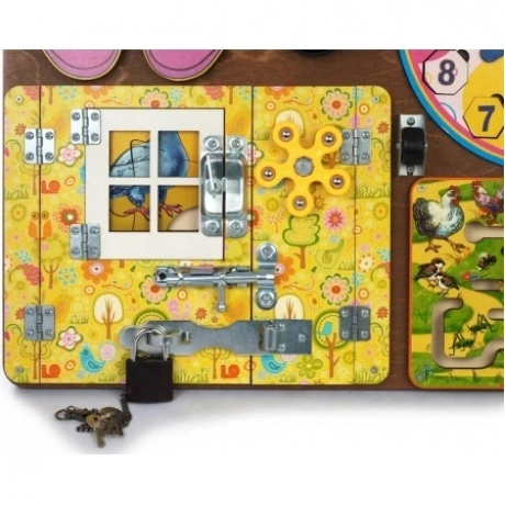 Бизиборд Нескучные игры № 2, 7903 понравится любому малышу. Это развивающая доска, на которой расположено множество интересных игр для ребенка: - Разные кнопочные выключатели, звонок, крутящиеся колесики. - Задвижки, крючки разного типа, замочек с ключиками. - Ботинки с металлическими петельками-колечками, через которые можно продевать шнурок. - Лабиринт, по дорожкам которого можно перемещать деревянного цыпленка. - Часики с вращающимися стрелками и вкладышами разной формы. - Деревянные пазлы из 4-х деталей. За закрытыми дверцами находится 4 окошка. В каждом окошке вынимающаяся дощечка с изображением птичек. Дощечки разрезаны на 4 части, скрепляющиеся между собой по принципу пазла. Внутри окошек пазлы будет легче собирать. Цифры на часах расположены на вынимающихся деталях разной формы. Можно использовать их как рамку-вкладыш, и предложить ребенку подобрать каждой фигурке свое окошко. Вкладыши на магнитной основе, их можно прикреплять на любую металлическую поверхность (холодильник или специальную доску) и использовать отдельно для изучения цифр и геометрических фигур. Игры рассчитаны на разный возраст. Такой бизиборд для девочки сможет прослужить ребенку несколько лет. Малыш будет нажимать кнопочки и звенеть ключиками. Затем научится открывать простые задвижки, вытаскивать вкладыши, расшнуровывать ботинки. И в конце сможет открыть замочек ключами, подобрать вкладыши к отверстиям, сложить пазлы и зашнуровать ботинок.