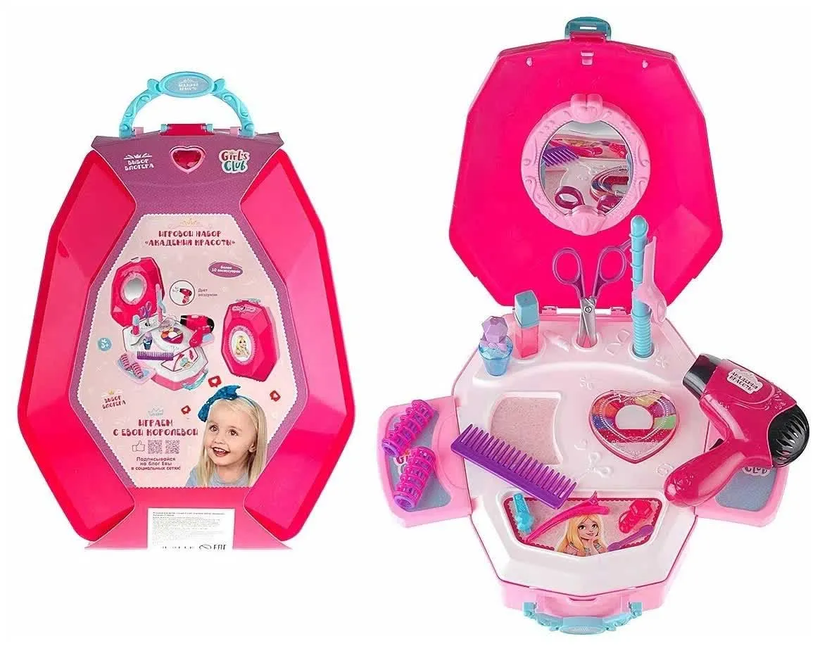 Игровой набор Girls Club Модница 12 предметов без сомнения понравится любому ребенку. В наборе 12 предметов, фен на батарейках - дует воздухом. Чемоданчик можно использовать как рюкзачок