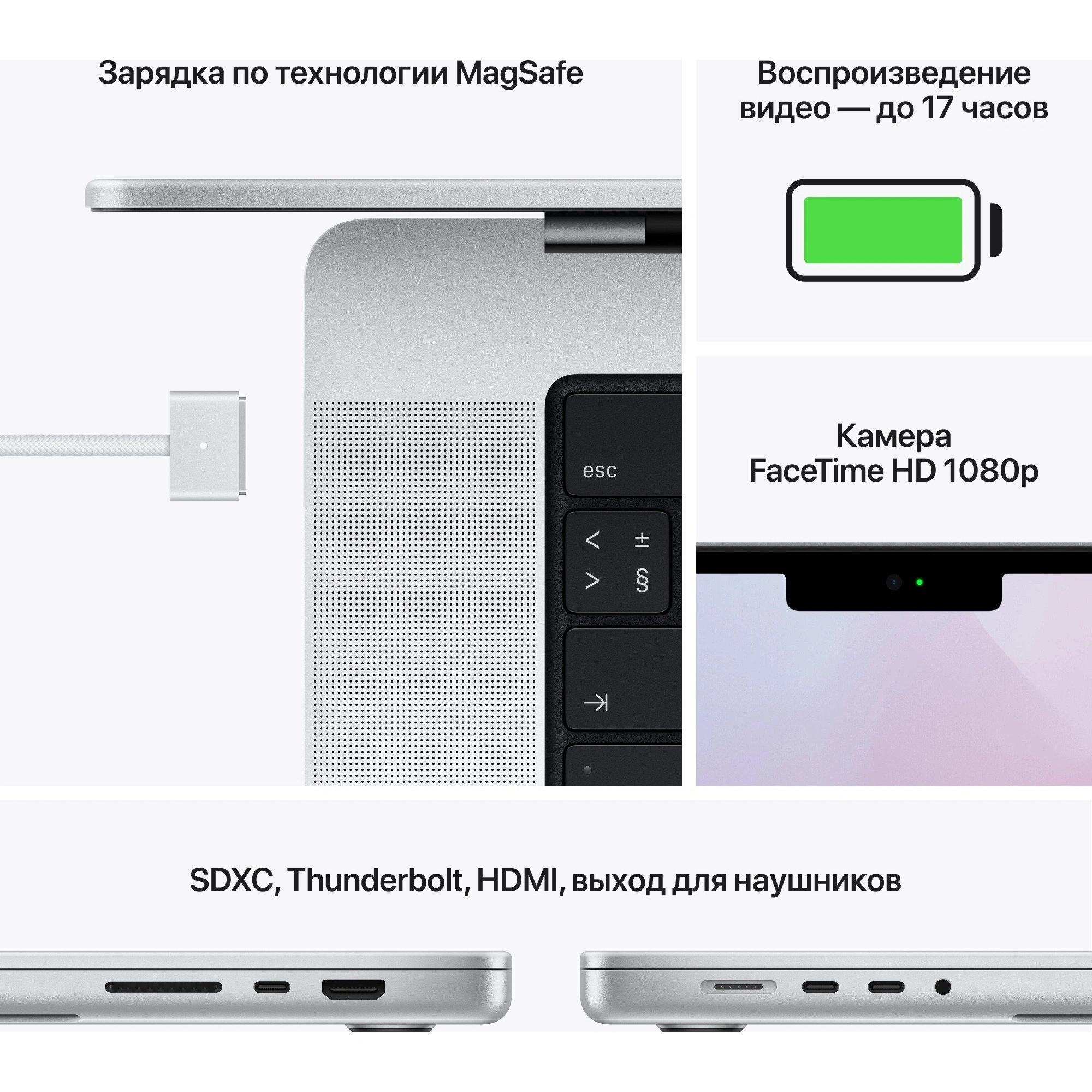 Ноутбук Apple MacBook Pro 14 Silver (MKGT3RU/A) с беспрецедентной производительностью открывает невероятные возможности профессионалам. Вы можете выбрать мощный чип M1 Pro или ещё более мощный M1 Max — для максимально сложных задач. В обоих вариантах ноутбук будет очень долго работать без подзарядки. А превосходный дисплей Liquid Retina XDR с диагональю 16 дюймов и большой набор портов станут дополнительными преимуществами.