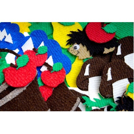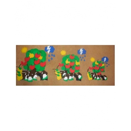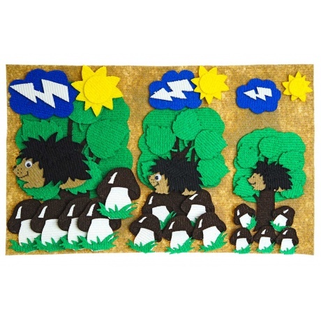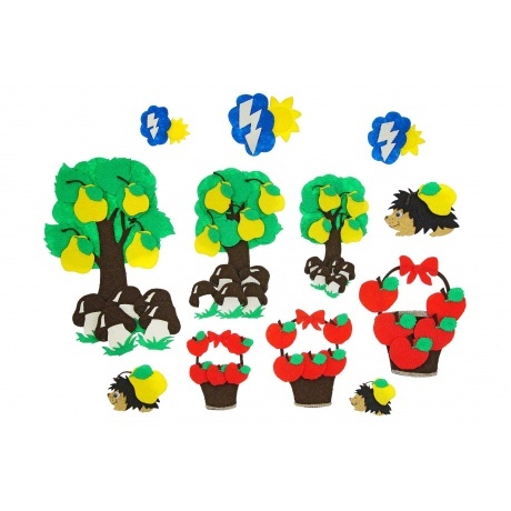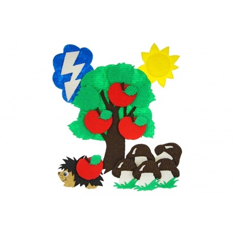 игровое поле 28x45см, дерево, солнышко, тучка с молнией, корзинка, ежик разного размера по 3 шт., листики 9шт., яблоки, груши, грибы по 15 шт.