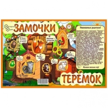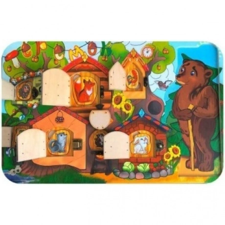 Развивающая игрушка Нескучные игры Теремок 7819 49х32 понравится любому малышу. Перед нами настоящий теремок с 7 дверцами. Каждая дверца закрывается на свою защелку. Все замки разные, поэтому придется потрудиться и подумать, открывая их. За каждой дверцей прячется один из персонажей сказки Теремок: мышка, лягушка, зайчик, ежик, петух, лиса, волк. Даже не открывая дверцу, можно догадаться, кто где спрятался: над дверцей написана первая буква названия животного, а рядом нарисованы их любимые лакомства. Фигурки животных можно вынуть из доски и поиграть ими отдельно. Отдельной задачей будет найти каждому персонажу свое место и правильно вставить фигурку в отверстие. Для того, чтобы легче было вынуть фигурку из основания, рядом расположено отверстие для пальца. Но на этом сюрпризы игры не заканчиваются. С правой стороны за елкой прячется медведь. Елка - это пазл, состоящий из 9 частей. Детали можно вынуть из основания, а затем вновь сложить картинку. Таким образом мы видим, что доска с замочками Теремок - многофункциональна игрушка. Это и различные виды замочков, и рамка-вкладыш, и пазл. Игра с такой доской развивает мелкую моторику рук, логику, глазомер ребенка. Малыш повторяет названия животных и их привычки.