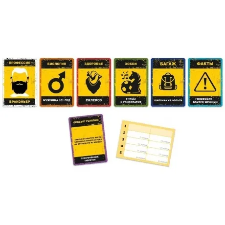 50 карт профессий 30 карт навыков 30 карт биологических характеристик 30 карт здоровья 30 карт хобби 30 карт фобий 30 карт багажа 30 карт дополнительной информации 10 карт описания бункера 7 карт катастроф 50 карт специальных условий, источник, упаковка