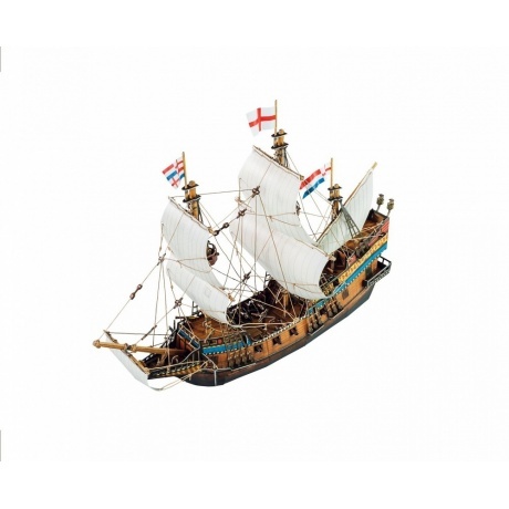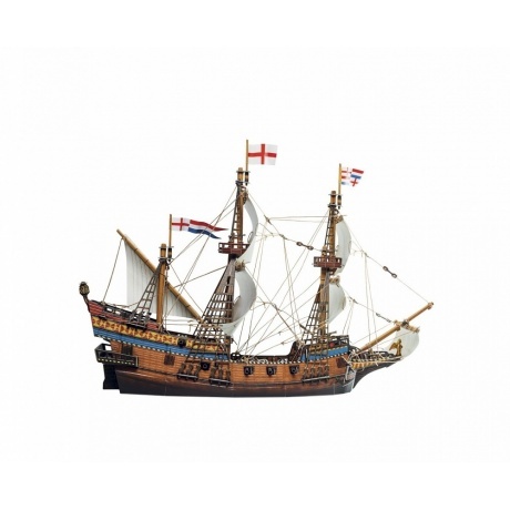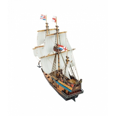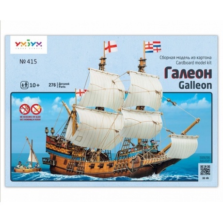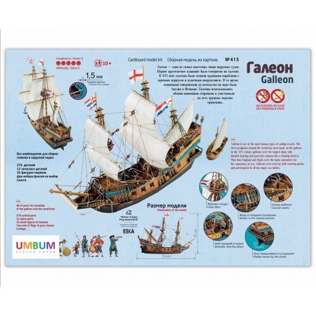 Галеон — один из самых известных типов парусных судов. Галеоны были самыми крупными кораблями своего времени, с прочным корпусом, тремя высокими мачтами, с пушечным вооружением. Появление таких кораблей изменило ход морского боя. В XVI веке основными соперниками за господство на море были Англия и Испания. Галеоны использовались обеими воюющими сторонами и участвовали во всех крупных морских сражениях. Фигурки мореходов, артиллеристов и воинов включены в набор. Также в наборе есть детали для сборки парусной лодки. Два комплекта флагов дают возможность выбрать, на чьей стороне ваш боевой корабль. Есть флаги Английского флота, а также флаги Испанской Непобедимой армады. Сочетание в модели корабля материалов разного характера не только обогащает впечатление от модели, но и делает сборку более сложной. При переходе на новый материал нужно приспосабливаться к его свойствам, менять приемы работы. Это разнообразие делает сборку еще интересней. Для сборки модели не понадобятся режущие инструменты или клей. Детали уже вырезаны и нужно просто вынуть их из листа картона и соединить между собой.