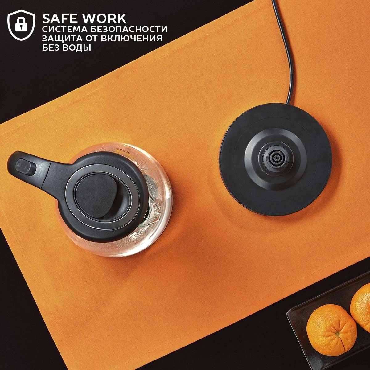 Электрический чайник, мощность 1800 Вт, объем 1.8 л, материал корпуса пластик/стекло, нагревательный элемент закрытая спираль, дополнительные функции: индикация включения, подсветка воды, подставка с вращением на 360°.