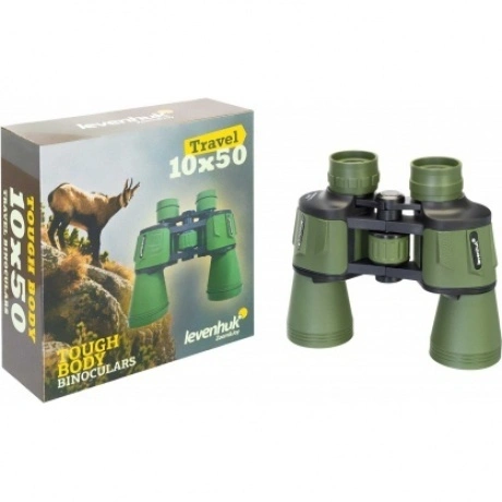 Levenhuk Travel 10x50 – это сочетание мощного 10-кратного приближения и больших светосильных объективов. Такой бинокль станет отличным компаньоном для охоты, рыбной ловли, похода по горам и лесам. Где бы вы ни оказались, надежный оптический помощник даст возможность увидеть больше. Прибор выполнен в прочном корпусе, материалом которого послужил алюминиевый сплав. Наружное прорезиненное покрытие обеспечивает надежный хват. Вести наблюдения можно не только с рук, но и со штатива – в конструкции предусмотрено стандартное гнездо для установки (дополнительно потребуется переходник). Основа оптической схемы бинокля Levenhuk Travel 10x50 – классические Porro-призмы. Оптические элементы сделаны из стекла BK-7 с полным просветлением, которое совершенствует изображение, обеспечивая высокую яркость и контрастность. Даже в сумерках или тумане вы сможете наблюдать ясную и четкую картинку, без труда различая все детали. Резкость настраивается с помощью центрального барабана. Еще один плюс модели – возможность складывать наглазники окуляров, что особенно удобно при ношении очков. Есть здесь и опция диоптрийной подстройки, причем в широком диапазоне – каждый пользователь сможет идеально подстроить бинокль под себя.