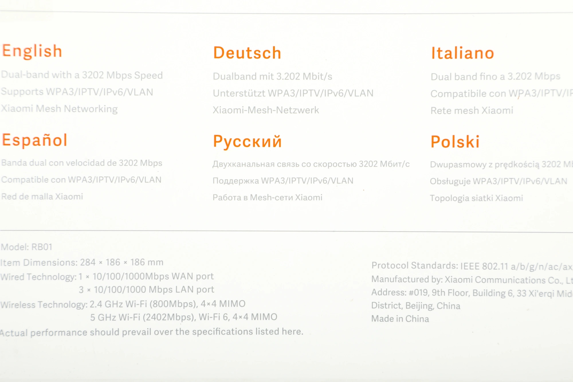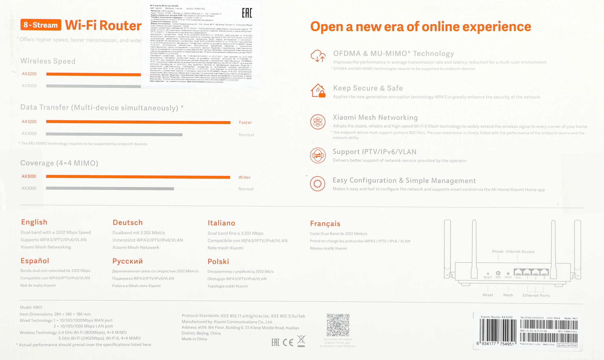 Xiaomi AX3200 работает на двух частотах: 2,4 ГГц и 5 ГГц. Две частоты не создают взаимных помех и имеют максимальную скорость беспроводного соединения на уровне до 3202 Мбит/с. Сверхбыстрый Интернет, стабильное покрытие сети, высокая скорость и плавное воспроизведение HD-видео и игр в высоком разрешении с Xiaomi AX3200 будут обеспечены благодаря Xiaomi AX3200.