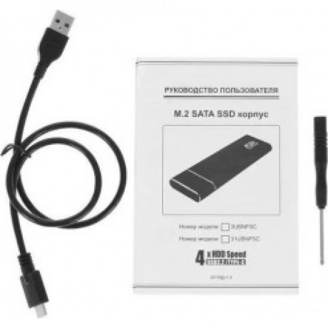 Для подключения твердотельного накопителя внутри бокса используется производительный интерфейс M.2 SATA. Внешнее подключение к устройствам производится при помощи разъема USB-C с интерфейсом 3.2 Gen1, за счет чего максимальная скорость передачи данных может достигать 5 Гбит/с. Комплектация бокса включает в себя кабель USB-A – USB-C.
