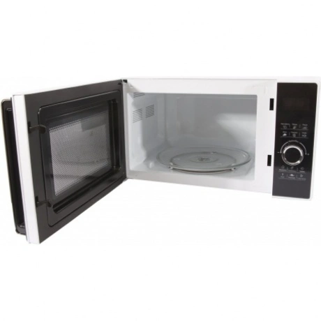 Микроволновая печь оборудована 6 программами автоматического приготовления и 5 уровнями мощности. Внутренняя камера объёмом 23 л позволит приготовить, разморозить и разогреть пищу, при этом устройство не займёт много места на кухне. Модель изготовлена из металла, внутреннее покрытие камеры выполнено из жаропрочной эмали. Диаметр поворотного стола — 27 см. Внутри есть подсветка. Дверь открывается с помощью ручки. Таймер позволяет установить время приготовления до 60 минут с точностью до 1 минуты. Звуковой сигнал оповестит об окончании работы. Максимальная мощность микроволновой печи — 800 Вт. Усиленный каркас дверцы из высокопрочного стекла обеспечивает дополнительную защиту от микроволнового излучения.