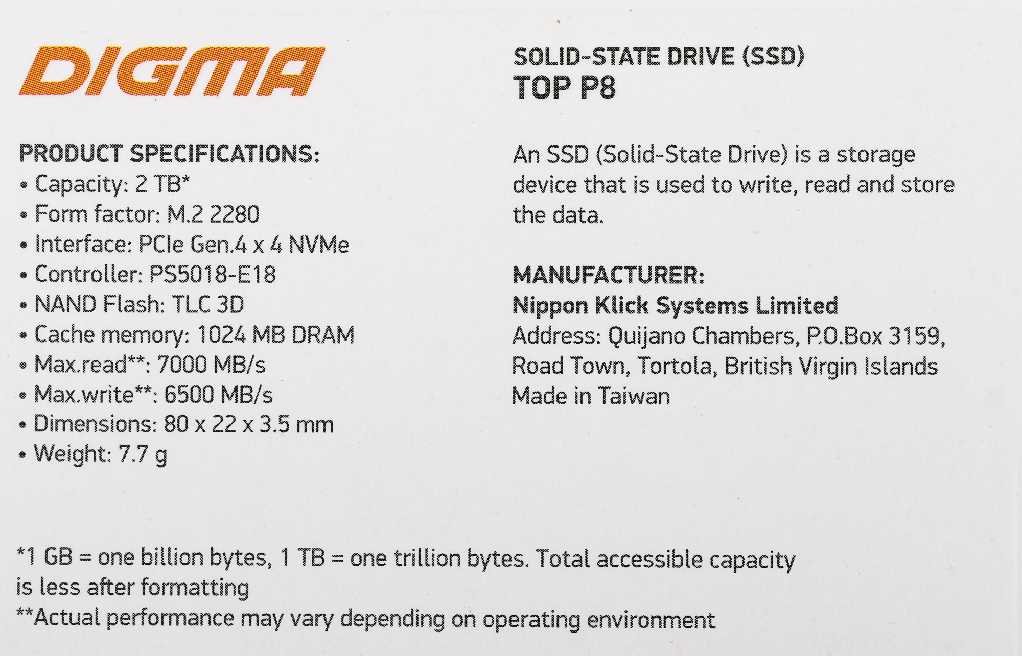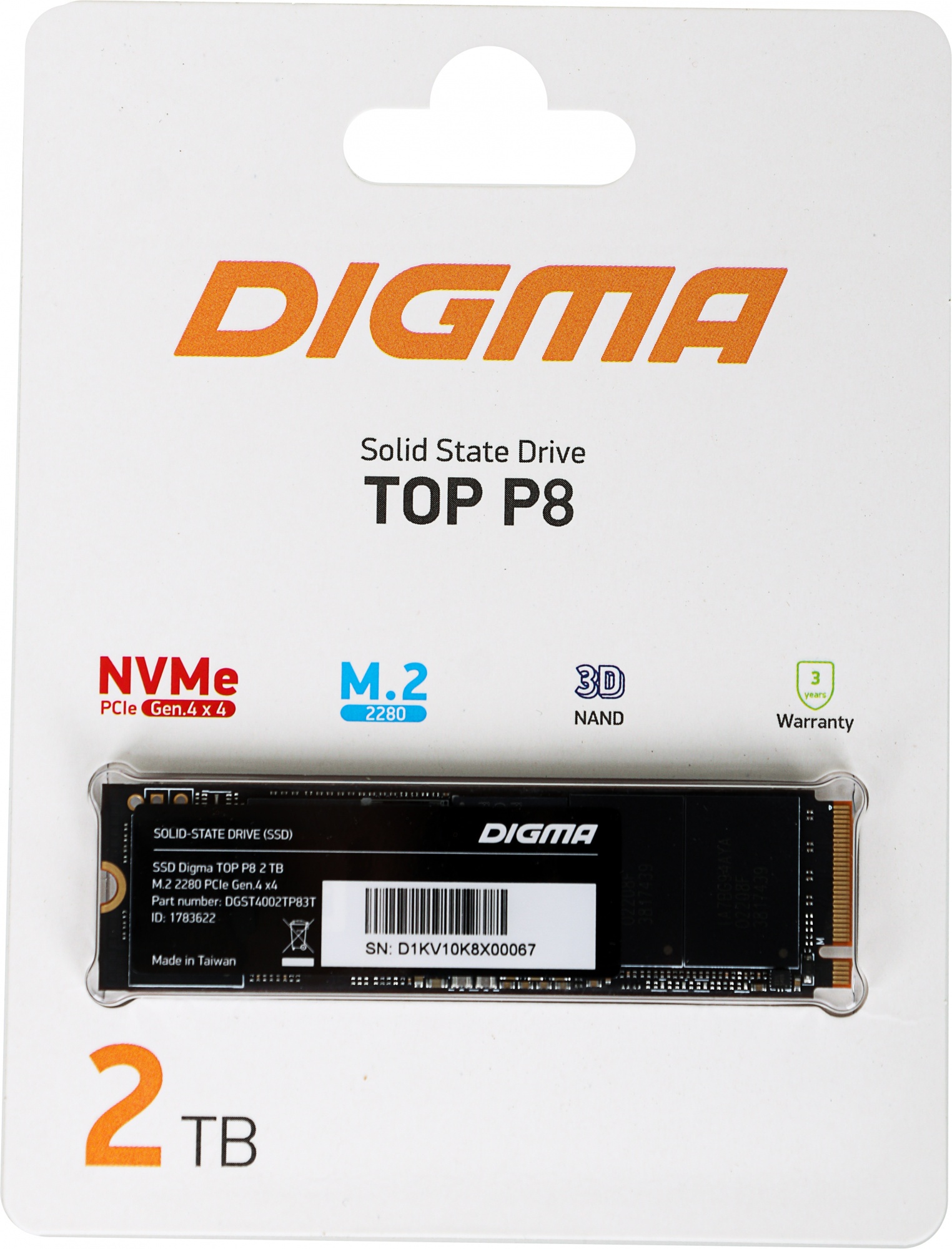 Твердотельный диск Digma Top P8 DGST4002TP83T емкостью 2TB с типом памяти TLC, предназначен для использования в домашних системах или ноутбуках, диск выполнен в формате M.2 2280 с интерфейсом подключения PCIe NVMe 4.0 x4 на базе контроллера Phison PS5018-E18.
