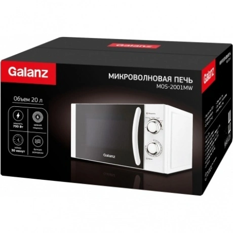 Микроволновая печь Galanz MOS-2001MW имеет мощность 700 Вт, объем 20 литров. Отличается элегантным внешним видом, простотой и практичностью в обращении. Обладает традиционным функционалом, подходит для разогревания и разморозки пищи. Прочное внутренне покрытие легко очищается от остатков пищи. Навесная дверца открывается с помощью ручки, а все параметры задаются при помощи поворотных переключателей. За счет таких простых решений освоить обращение с этой микроволновой печью сможет даже ребенок.