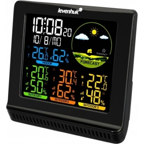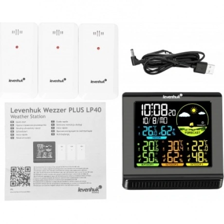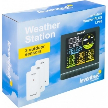 Levenhuk Wezzer PLUS LP40 – домашняя погодная станция с удобным цветным экраном и тремя выносными термогигродатчиками в комплекте. Прибор дает возможность своевременно узнавать о приближающейся непогоде, а также отслеживать изменения микроклимата в жилых и хозяйственных помещениях. Станция отлично проявит себя в загородном доме и на дачном участке, где нужно охватить обширную территорию – расстояние между основным блоком и датчиками может достигать 100 метров. На контрастном ЖК-экране метеостанции отображаются время, дата, день недели и символы прогноза погоды. Метеоданные представлены в разных цветах, что позволяет быстро сориентироваться в результатах измерений основного блока и радиодатчиков. В памяти станции сохраняются максимальные и минимальные значения влажности и температуры, а индикаторы-стрелочки помогают отслеживать тенденции к изменениям параметров. Есть здесь и будильник с опцией повтора сигнала через 5 минут. Метеостанция Levenhuk Wezzer PLUS LP40 может работать от батареек или подключаться к сети. Внешние датчики работают от батареек.