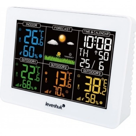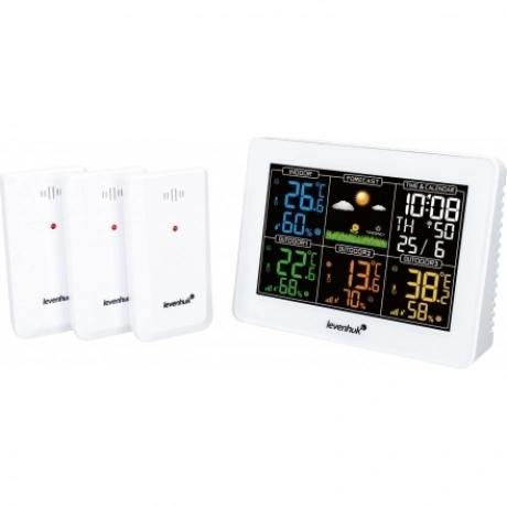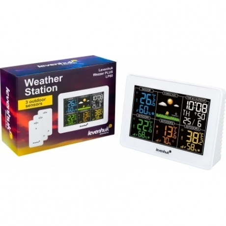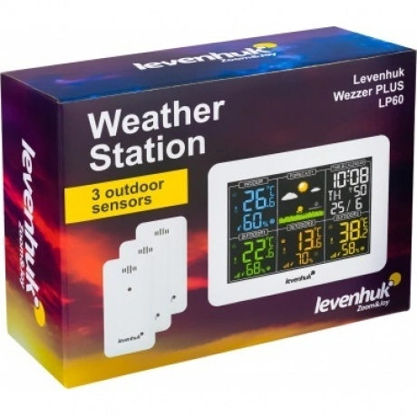 Метеостанция Levenhuk Wezzer PLUS LP60 – компактный гаджет для дома, офиса или загородного участка. Со станцией поставляются три внешних датчика, что позволяет быть в курсе погодных изменений сразу в четырех зонах. Метеостанция поможет поддерживать оптимальный микроклимат в жилых и хозяйственных помещениях и своевременно узнавать о приближающемся ненастье. Основной блок можно разместить на столе или подоконнике, а датчики оснащены настенными креплениями. На цветном ЖК-экране с подсветкой отображаются все результаты измерений, а также время, дата, день недели и прогноз погоды. Экран разделен на удобные для восприятия зоны, символы в которых отличаются по цвету. Возле данных температуры и влажности отображаются стрелочки, которые сообщают о тенденциях к повышению или понижению значений – вы всегда будете в курсе предстоящего похолодания. Есть здесь и будильник, сигнал которого откладывается на 5 минут одним нажатием кнопки. Беспроводные датчики можно установить на расстоянии до 100 метров от самой станции. Для питания используются батарейки, основной блок может также работать от сети.
