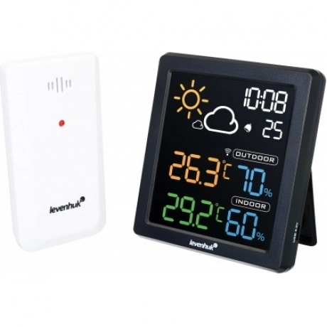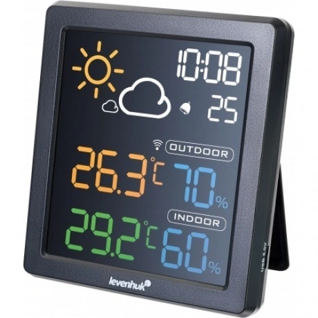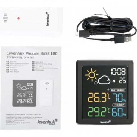 Levenhuk Wezzer BASE L80 – настенный термогигрометр с цветным ЖК-экраном. Благодаря привлекательному внешнему виду и многофункциональности он отлично подойдет на роль полезного подарка. Прибор регистрирует температуру и влажность как внутри, так и снаружи дома, фиксируя в памяти наибольшие и наименьшие показания. Есть здесь и наглядный прогноз погоды. Еще одно преимущество – наличие часов со встроенным будильником. Его сигнал откладывается на 5 минут одним нажатием кнопки. Термогигрометр Levenhuk Wezzer BASE L80 оснащен внешним беспроводным датчиком для измерений на улице или в другом помещении. Все показания можно увидеть на экране основного блока – они разделены на несколько зон и окрашены в разные цвета для удобства считывания информации. Экран подсвечивается, что очень удобно при недостатке внешнего освещения.