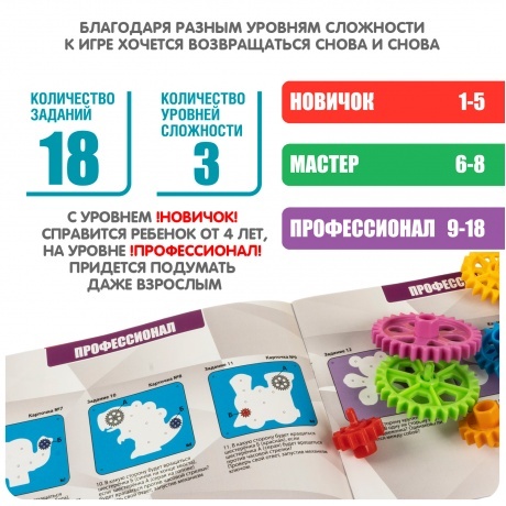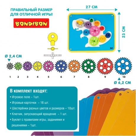 Настольная игра Bondibon Шестеренки.Волшебство механики BB5083 понравится любому ребенку. Дайте ребенку возможность почувствовать себя маленьким инженером!. Это же так интересно - самостоятельно закручивать шестеренки, собирать механизмы разной сложности и управлять ими. В головоломке Шестеренки. Волшебство механики от Bondibon Вас ждут яркие шестеренки разного размера, 18 заданий и 3 уровня сложности. В процессе игры Вам необходимо подключить шестерни, чтобы они вращались. Как заставить вращаться эти красочные шестерёнкиx Шестеренки крепятся в отверстия игровой доски. Установите их согласно заданию и попробуйте запустить механизм с помощью специального ключа из набора.