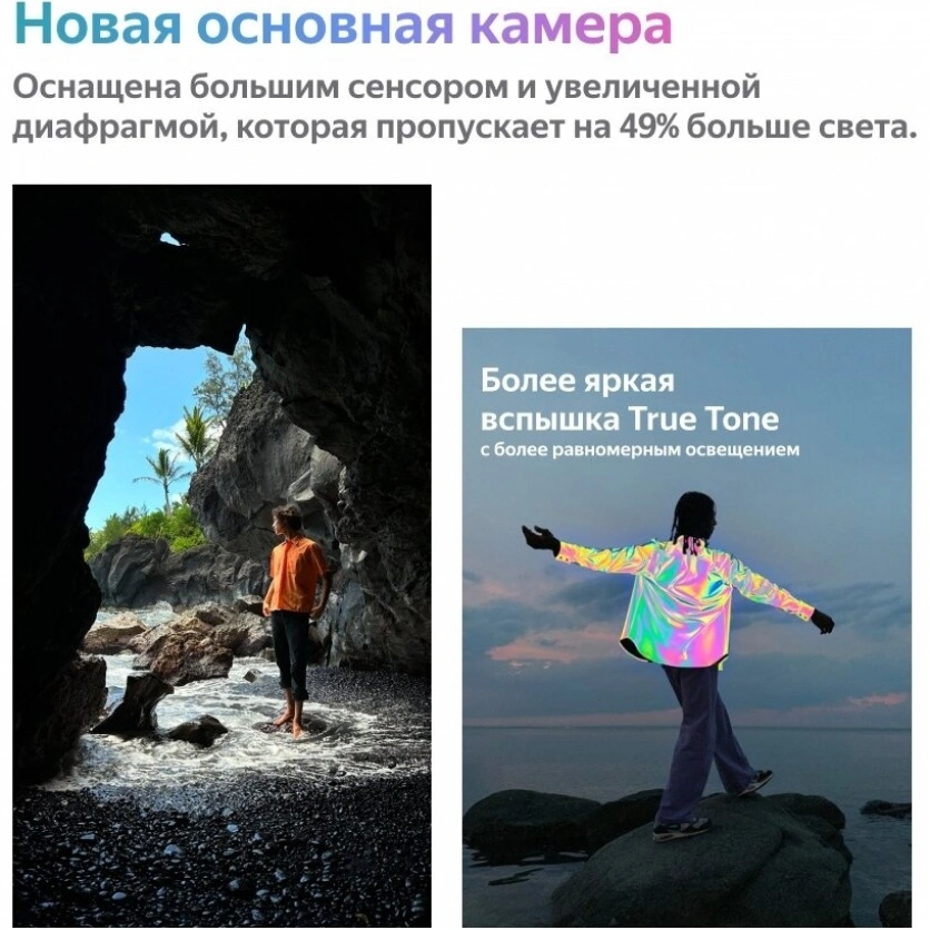 Тонкий и легкий смартфон из новой линейки Apple iPhone 14 с высоким разрешением OLED-экрана, хорошим объемом памяти и запасом автономности во влагостойком корпусе. Продвинутые камеры позволят снимать фото и видео в отличном качестве даже при слабом освещении. Функция экстренной помощи со связью через спутник выручит, когда нет возможности выйти в интернет. Мощный процессор откроет новые возможности для игр и развлечений.