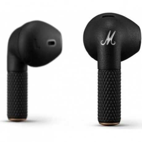 Наушники TWS Marshall Minor III поставляются с зарядным кейсом. Он выполнен из черного пластика с фактурной отделкой, которая по внешнему виду и тактильным свойствам имитирует кожу. Наушники имеют нескользящую рельефную насечку на корпусе и золотистые накладки. Закрытая акустическая система с 12-мм динамиками обеспечивает детализированное насыщенное звучание. Встроенный микрофон передает чистый голос собеседнику в процессе общения. Корпус устройства защищен от брызг воды по стандарту IPX4, поэтому подходит для активных занятий спортом и использования в разных погодных условиях. Для синхронизации со смартфоном применяется беспроводной интерфейс Bluetooth 5.2. Нажатием сенсорных кнопок можно переключать треки, отвечать на звонки, ставить музыку на паузу. Встроенный в каждый наушник Marshall Minor III аккумулятор гарантирует до 5 часов работы без подзарядки. Кейс увеличивает автономность до 25 часов.