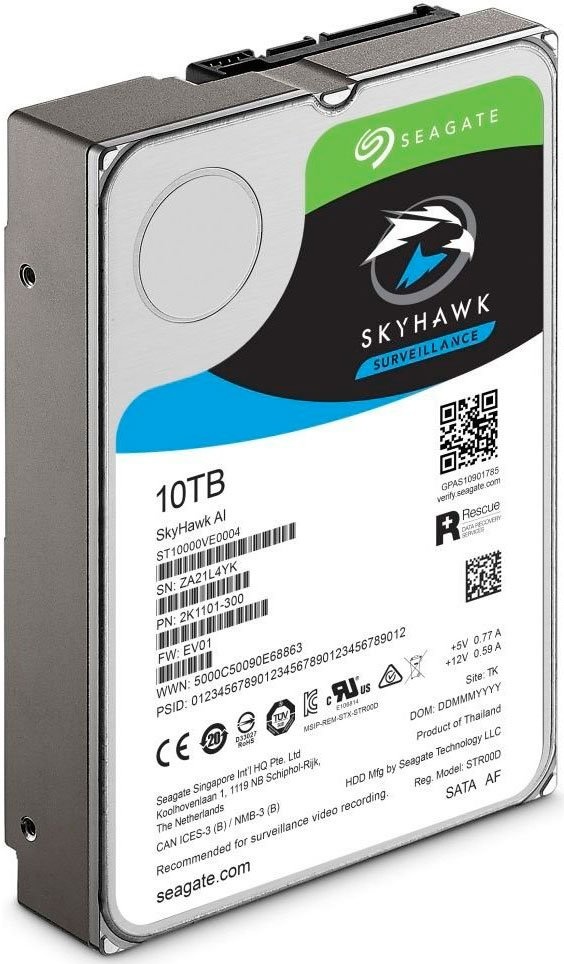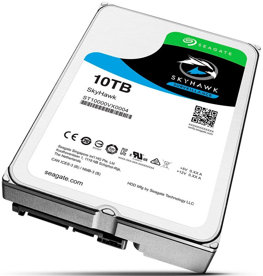 Жесткий диск Seagate разрабтан для использования в системах видеонаблюдания. Благодаря объему 10 ТБ на диск можно сохранить большое количество видеороликов одновременно с 64 HD-камер. Особенность накопителя в поддержке микропрограммы ImagePerfect AI. Она позволяет получить целостное изображение без потери данных и выпадения кадров в условиях постоянно работающих систем видеонаблюдения, в которых задействован искусственный интеллект. Seagate SkyHawk AI восстанавливает данные, поврежденные из-за механических проблем или вируса благодаря системе Rescue. Для подключения модель использует интерфейс SATA III с пропускной способностью 6 Гбит/с. Это позволяет достичь высокоскоростной передачи данных. Диск оптимизирован для использования в RAID-массивах, для чего оборудован датчиками вибрации. Кэш-память на 256 МБ обеспечивает высокую производительность HDD.