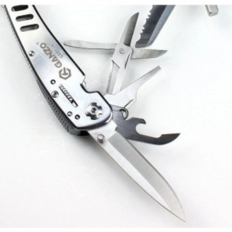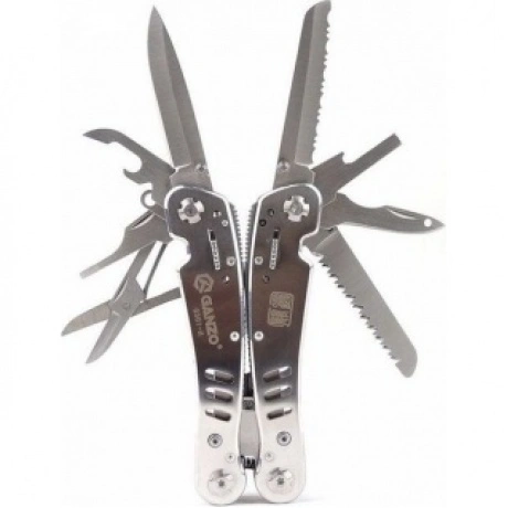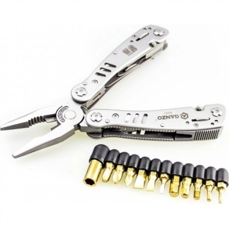 Удобный полноразмерный мультитул G301-H от компании Ganzo. Большой набор инструментов позволяет использовать модель G301-H для полноценного ремонта разнообразной техники. В комплект мультитула G301-H входят следующие инструменты: подпружиненные плоскогубцы с кусачками, два лезвия, одно из которых имеет серрейторную заточку, две плоских отвертки разного размера, пилу по дереву, ножницы, зенковку, удлинитель для адаптера, консервный нож. Также в комплект данной модели входит кассета с адаптером и набор разнообразных бит (3 плоских отвертки, 3 крестовых отвертки, 3 шестигранных ключа наиболее популярных размеров). Все инструменты мультитула G301-H выполнены из нержавеющей стали 440С. Биты, входящие в комплект, изготовлены из углеродистой стали. Металлические рукоятки мультитула G301-H имеют структурную поверхность, что способствует уверенному удержанию инструмента во время работы. Для безопасности использования, все инструменты модели снабжены фиксирующей защелкой.