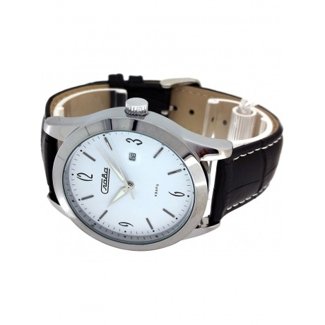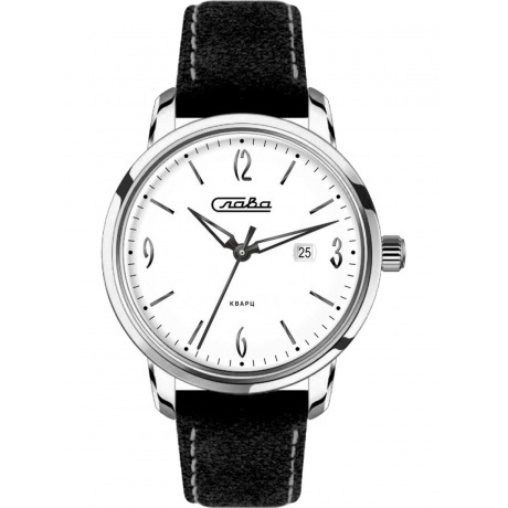 Мужские наручные часы Слава с круглым корпусом и кожаным ремешком. Присутствует окошко даты. Циферблат закрывает минеральное стекло с сапфировым покрытием. Ремешок с классической застежкой.