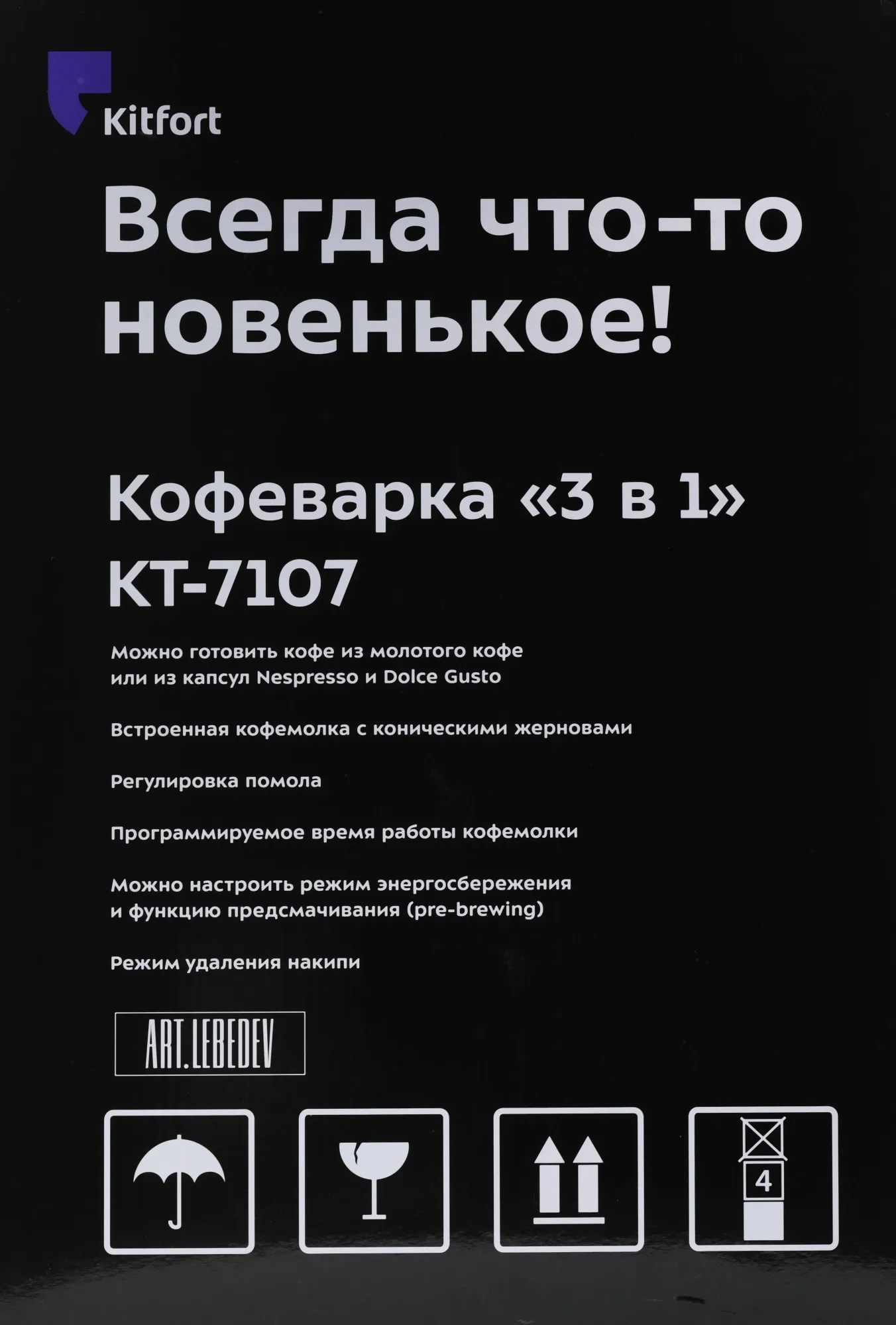 Кофемашина капсульная KITFORT КТ-7107 представлена в черном корпусе с простым кнопочным управлением, индикаторами включения и отсутствия воды. Устройство оснащено 4 режимами приготовления разных напитков, регулировкой порции и функцией автоотключения. Программа самоочистки упрощает уход за кофемашиной. Благодаря работе с давлением 19 Бар и наличию 3 адаптеров KITFORT КТ-7107 поддерживает капсулы разных производителей, готовит ароматный и насыщенный эспрессо. Устройство дополнено встроенной кофемолкой. Отдельный адаптер и мерная ложка позволяют готовить бодрящий напиток из молотых сортов кофе.