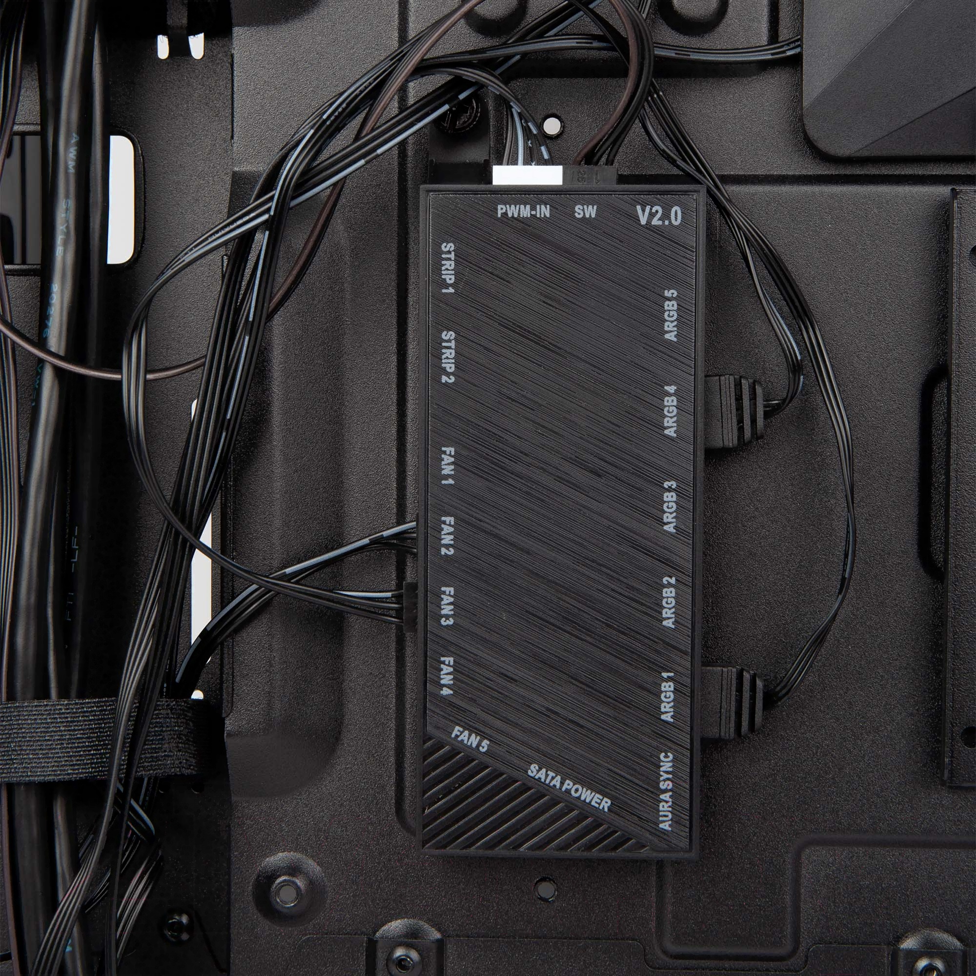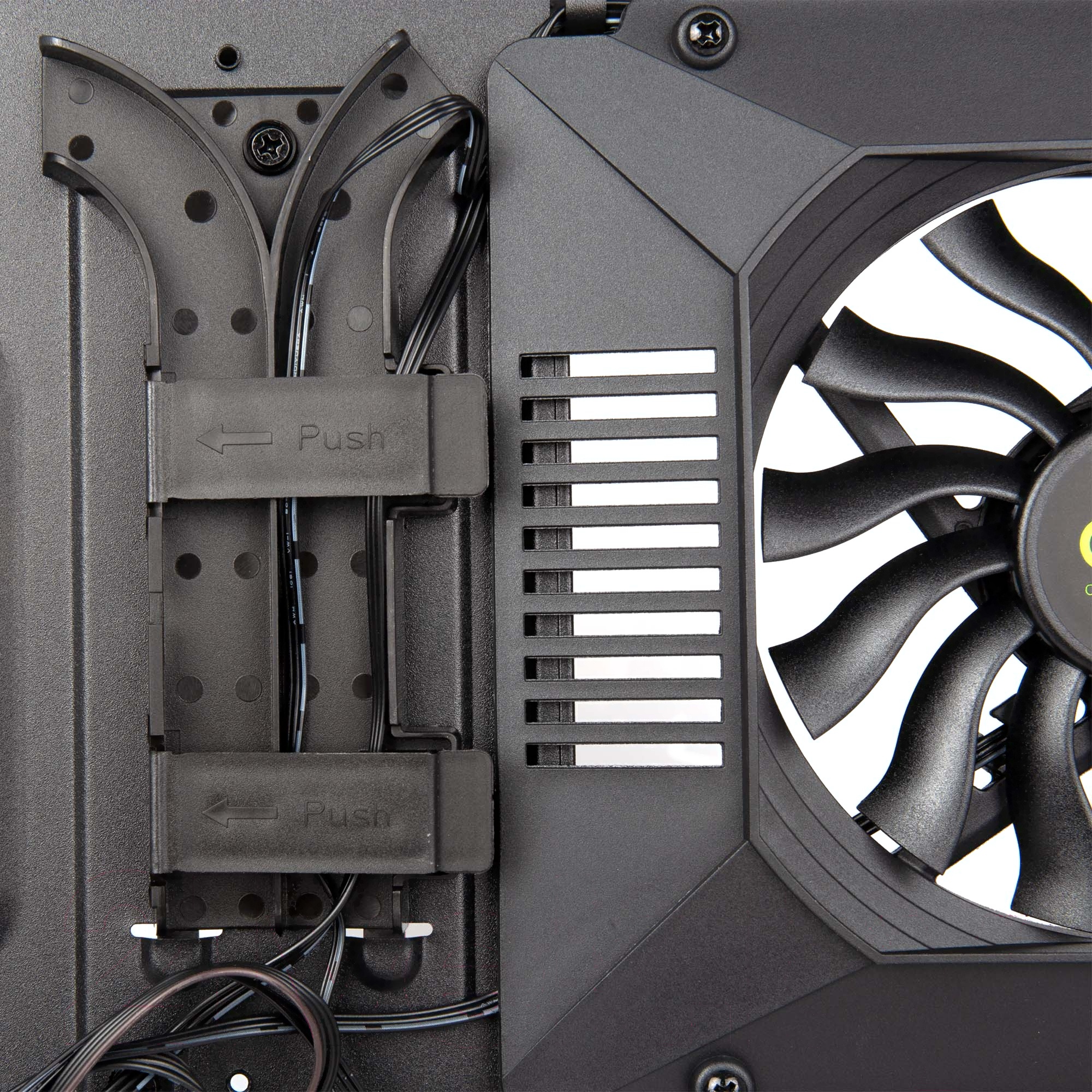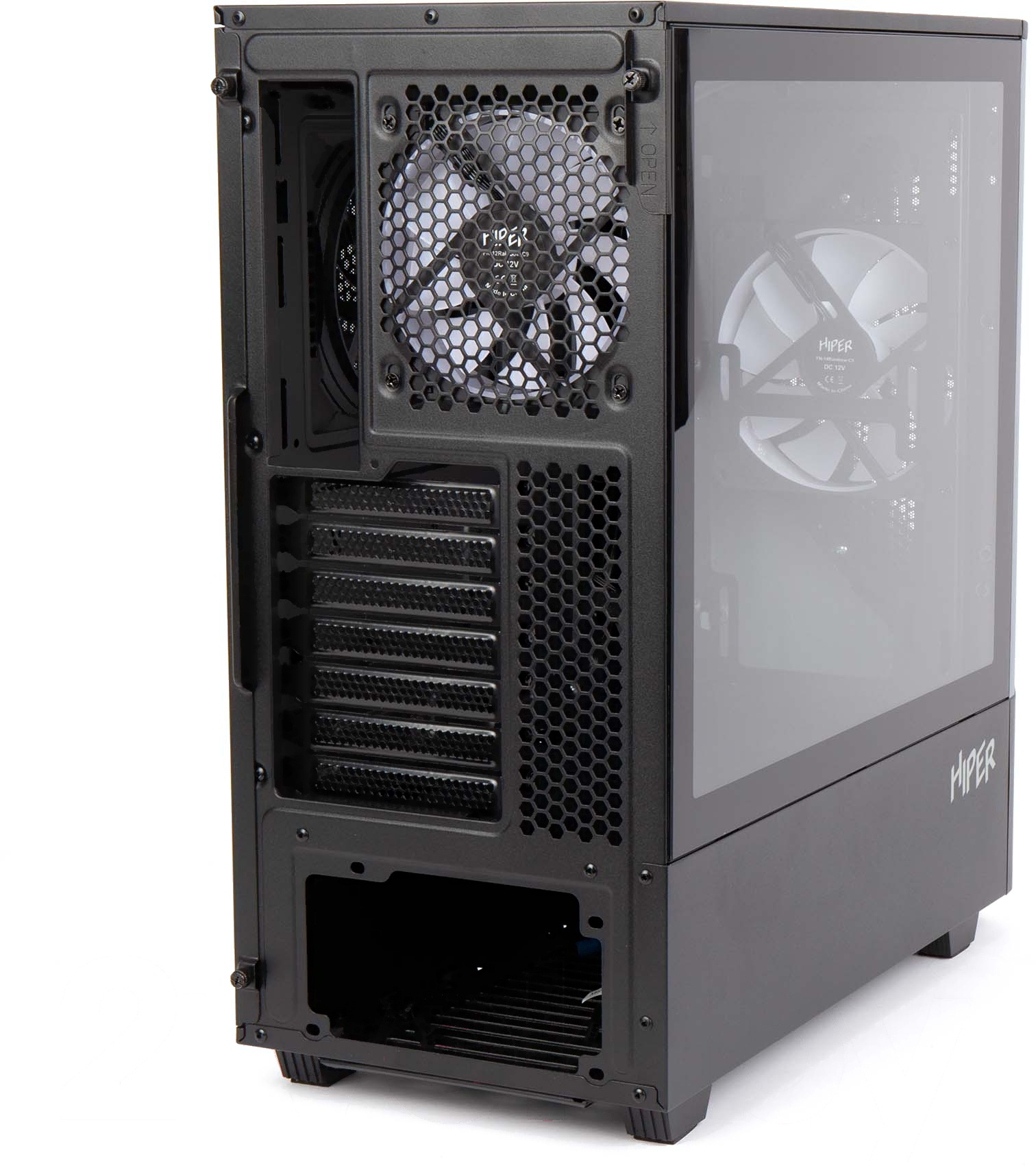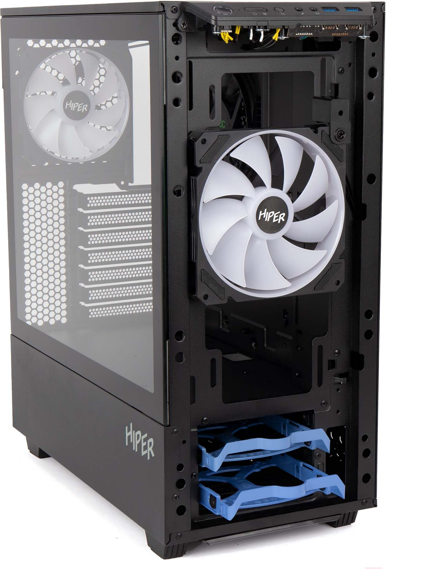 Корпус ATX HIPER CC BG имеет многоцветную ARGB-подсветку, оснащен 120-миллиметровым и двумя 140-миллиметровыми вентиляторами, один из которых предназначен для дополнительного охлаждения материнской платы. Расположение блока питания нижнее, что улучшает циркуляцию воздуха. Есть 7 слотов для установки плат расширения.