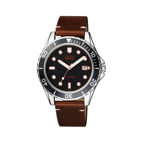 Мужские наручные часы Q&Q на кожаном ремешке. На циферблате присутствует апертура текущего числа. На вращающемся безеле нанесена секундная разметка. На стрелки и часовые метки нанесен светонакопительный состав для возможности считывания времени в темноте. Ремешок с классической застежкой. Точность хода обеспечивает кварцевый японский механизм Miyota 2315.