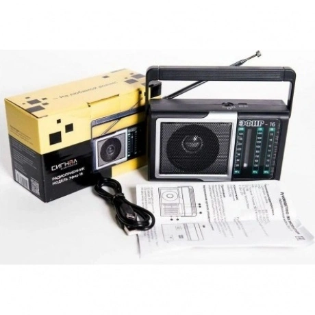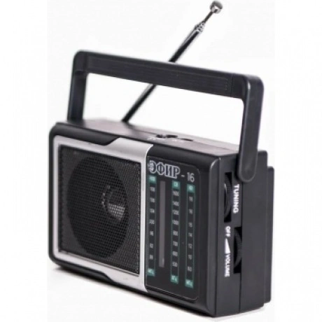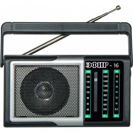 Радиоприемник Эфир-16 – это недорогой радиоприемник, который станет прекрасной альтернативой китайскому no name. Целевая аудитория данного радиоприемника – это дачники, любители природы, городские жители, подойдет как пожилым, так и молодым людям. Корпус выполнен в черном цвете, его масса в упаковке составляет не более 220гр. Эфир-16 имеет аналоговый тип тюнера, обеспечивает сигнал в диапазонах УКВ/СВ/КВ с частотой УКВ (88-108)МГц / СВ (530-1600)КГц / КВ (8.0-18.0)МГц соответственно, наличие 1-го динамика с мощностью 3Вт. Радиоприемник работает через блок питания 5В, батареек АА*2шт, либо от аккумулятора емкостью 500мАч. Размер изделия составляет 140х41х76мм. Товар сертифицирован.