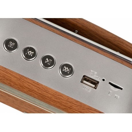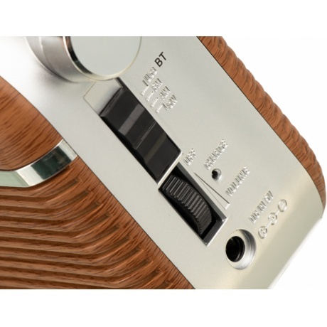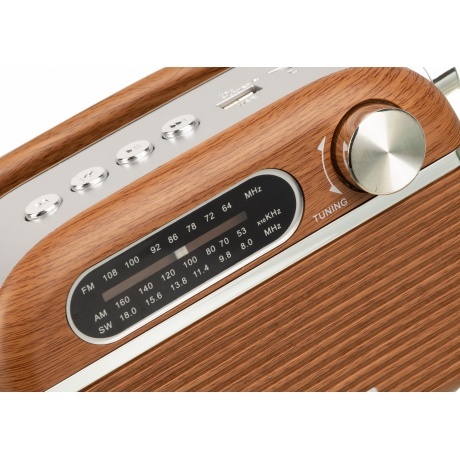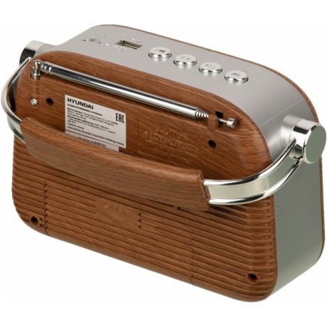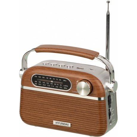 Радиоприемник Hyundai H-PSR200 - стильный прибор, отличающийся винтажным внешним видом. Корпус выполнен из ударопрочного матового пластика, стилизованного под дерево. Серебристые накладки и ручка формируют узнаваемый стиль. Центральную часть занимает динамик, который выдает чистый и объемный звук. Телескопическая антенна принимает сигналы радиостанций в трех диапазонах частот. Поиск осуществляется с помощью поворотной ручки. Для управления предусмотрены удобные кнопки. Радио можно переносить с помощью ручки, надежно закрепленной на корпусе шарнирными креплениями. Для прослушивания любимых композиций можно использовать съемный USB накопитель или карту памяти. Функционирование происходит за счет аккумуляторной батареи или от сети. Для зарядки АКБ есть провод, входящий в комплект. Прибор устойчиво стоит на прорезиненных ножках, предотвращающих скольжение.