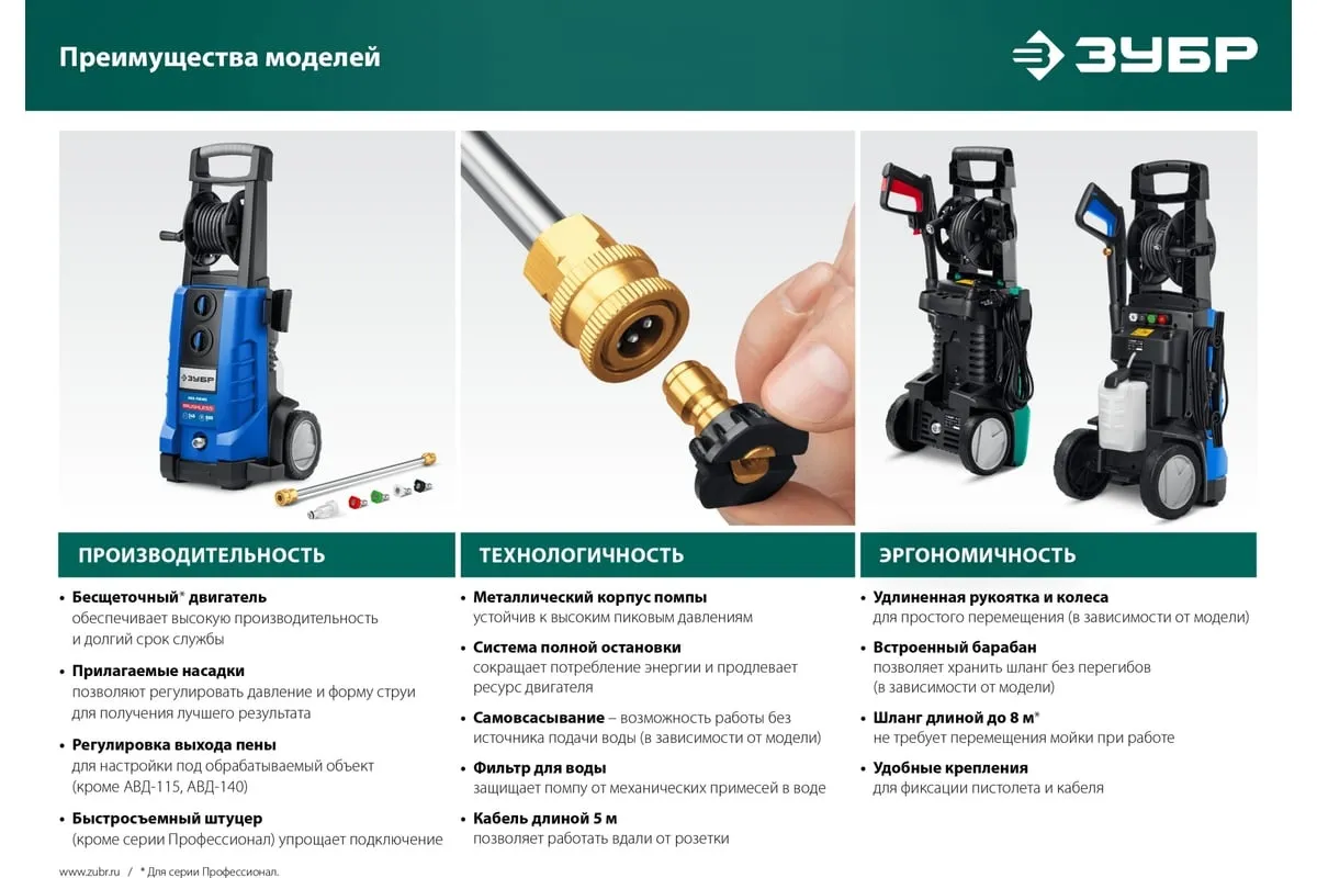 Мойка высокого давления ЗУБР Профессионал АВД-П200 используется для мойки автомобилей, велосипедов и другой колесной техники, садового инвентаря, наружных стен и уличных покрытий. Изделие предназначено для использования только вне помещений. Оснащена бесщеточным двигателем с низкими оборотами и высоким крутящим моментом. Благодаря системе полной остановки, помпа не работает при не нажатом пистолете – это экономит воду и ресурс изделия при неизбежных паузах в работе. Элегантный дизайн и удобная конструкция с держателями для аксессуаров делают работу с изделием комфортной. Регулировка давления и формы выходной струи позволяет обрабатывать различные поверхности - автомобили, стены, велосипеды, напольные покрытия и другое.