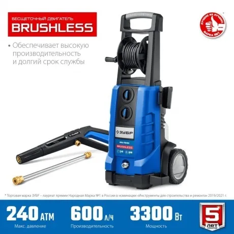 Мойка высокого давления ЗУБР Профессионал АВД-П240 используется для мойки автомобилей, велосипедов и другой колесной техники, садового инвентаря, наружных стен и уличных покрытий. Изделие предназначено для использования только вне помещений. Оснащена бесщеточным двигателем с низкими оборотами и высоким крутящим моментом. Благодаря системе полной остановки, помпа не работает при не нажатом пистолете – это экономит воду и ресурс изделия при неизбежных паузах в работе. Элегантный дизайн и удобная конструкция с держателями для аксессуаров делают работу с изделием комфортной. Регулировка давления и формы выходной струи позволяет обрабатывать различные поверхности - автомобили, стены, велосипеды, напольные покрытия и другое.