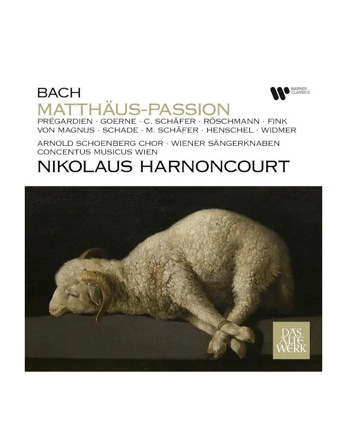 Эта запись получила премию «Грэмми» за лучшее хоровое исполнение и «Золотой диапазон» в 2001 году и входит в число 100 величайших записей Gramophone: совершенное исполнение шедевра Баха «Страсти по Матфею». JOHANN SEBASTIAN BACH 1685–1750. Matth?us-Passion BWV 244. St Matthew Passion · Passion selon St Matthieu. Christoph Pr?gardien tenor (Evangelista). Matthias Goerne bass* (>esus). Christine Schafer soprano I** (Ancilla I, Uxor Pilati). Dorothea R?schmann soprano II. Bernarda Fink contralto I. Elisabeth von Magnus contralto II (Ancilla II, Testis I). Michael Schade tenor I. Markus Schafer tenor II (Testis II). Dietrich Henschel bass I (Judas, Petrus, Pontilex I, Pilatus). Oliver Widmer bass II. Wiener S?ngerknaben Chorus master: Norbert Balatsch. Arnold Schoenberg Chor Chorus master: Erwin Ortner. Soloist: Jan Leibnitz (Pontifex II). Concentus musicus Wien. with original instruments · mit Originainstrumenten · avec instruments originaux. NIKOLAUS HARNONCOURT.