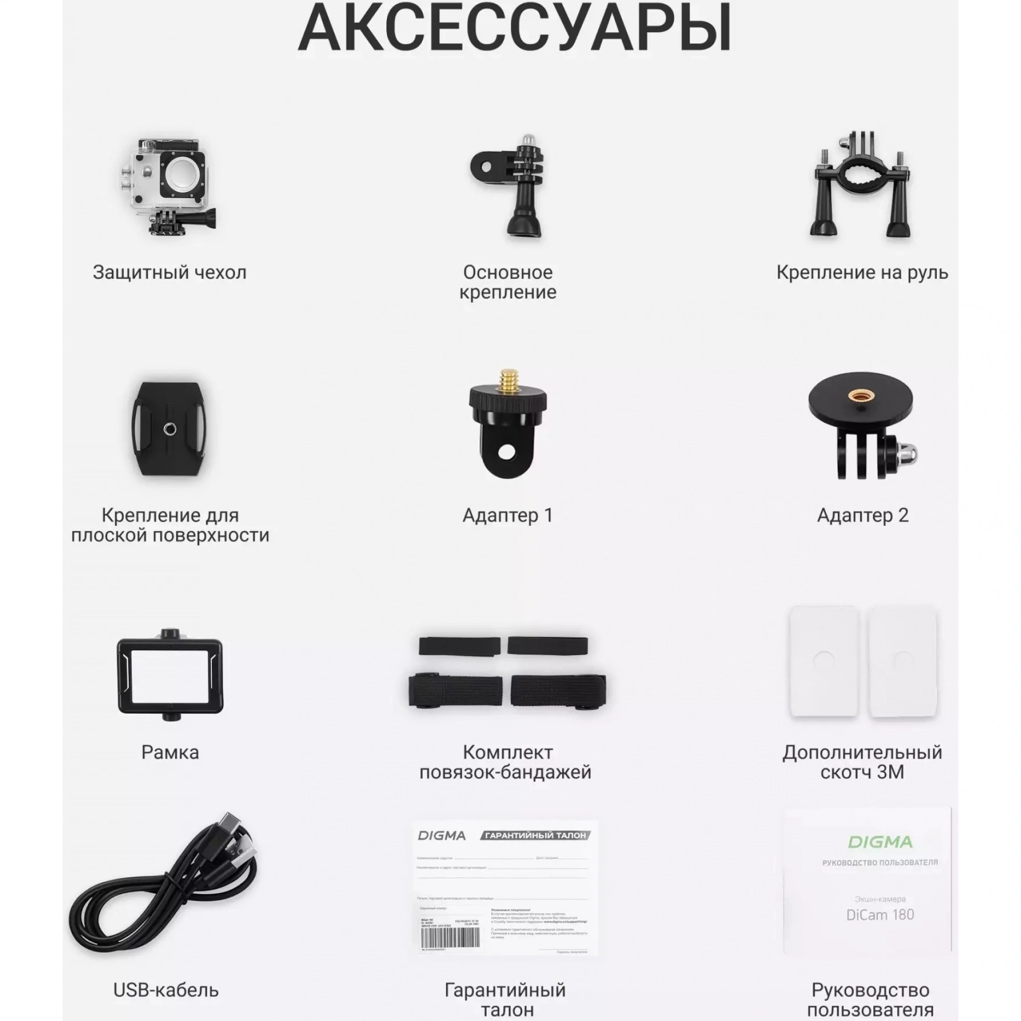 камера, крепление на руль/трубу/раму, крепление поворотное, переходник с винтом 1/4, площадка ровная клеящаяся, ремешок-липучкаx2 шт., ремешок регулируемый с фиксаторомx2 шт., скотч двусторонний для крепленийx2 шт.