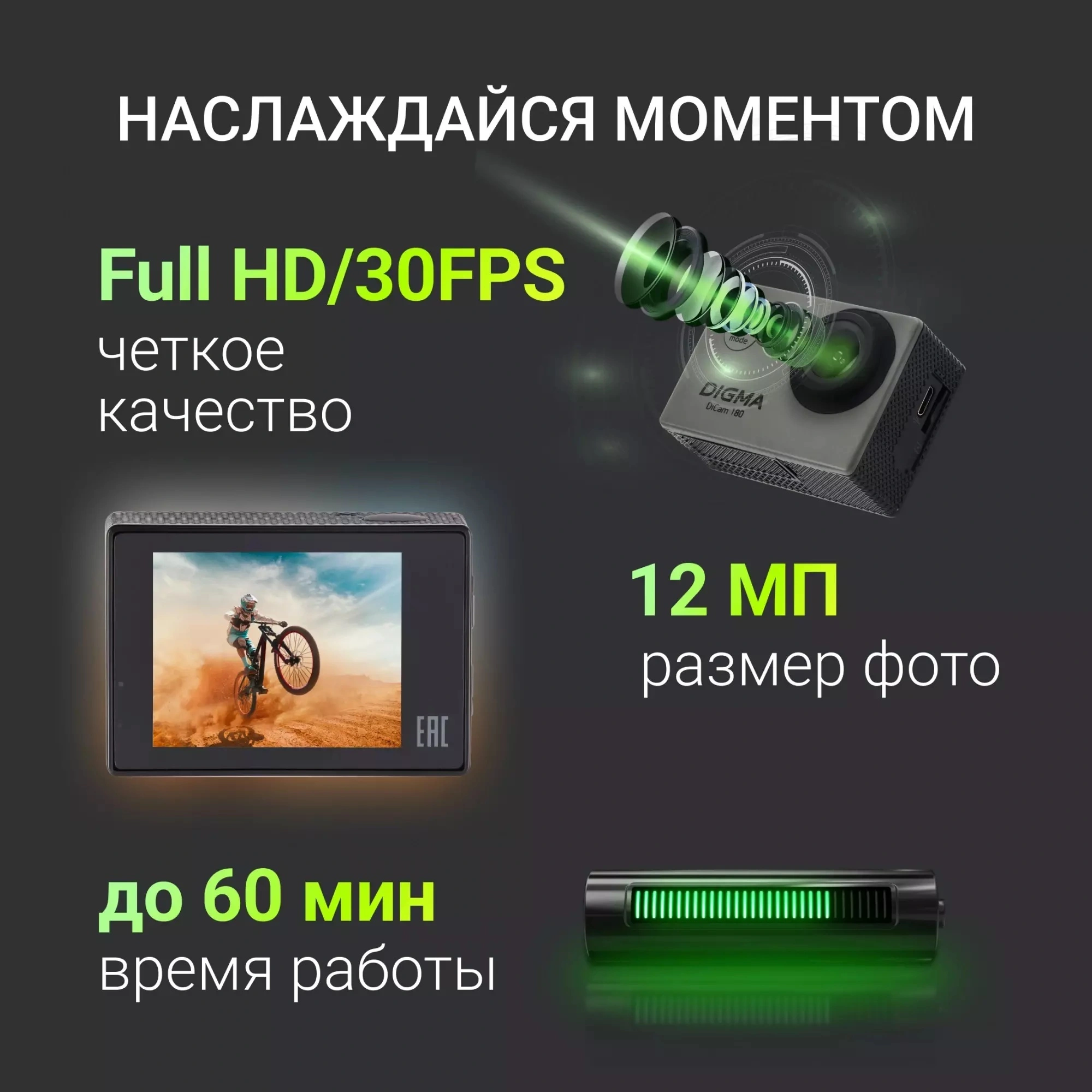 Экшн-камера Digma DiCam 180 записывает видео в формате AVI с максимальным разрешением Full HD. Это позволяет получить качественные ролики с оптимальной детализацией. Благодаря интегрированному микрофону можно записывать голос и окружающие звуки. Модель создает фотографии в формате JPG и поддерживает режим непрерывной съемки, что позволяет сделать серию кадров и запечатлеть динамичные события. Для сохранения файлов нужно установить карту microSD объемом до 32 Гб. Экшн-камера Digma DiCam 180 оснащена портом USB для подключения к ноутбуку или компьютеру. Цветной LCD-дисплей позволяет просматривать записи, кнопки управления на корпусе - устанавливать рабочие параметры. Источником питания устройства служит литиево-ионный аккумулятор, который обеспечивает стабильное функционирование в автономном режиме на протяжении определенного времени. В комплекте с камерой поставляется водонепроницаемый бокс, за счет чего можно проводить съемку под водой.