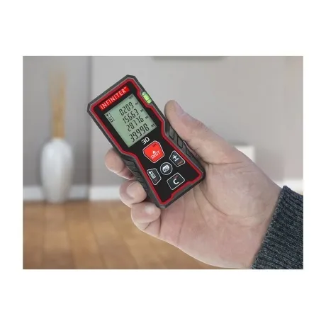 Лазерный дальномер INFINITER 30 1-2-325 используется для измерения расстояний, длин, высот, проведения вычисления площадей и объемов измеряемых объектов, а также косвенных измерений с помощью теоремы Пифагора. Можно производить измерения как в помещении, так и на улице. Оснащен пузырьковым уровнем для получения наиболее верных результатов измерений. Данная модель имеет яркий дисплей и крупные цифры, которые прекрасно видно как в темноте, так и при свете. Для удобного использования предусмотрен небольшой вес и компактные размеры. Боковые части корпуса оснащены ребристой поверхностью, поэтому прибор не будет скользить в руке.