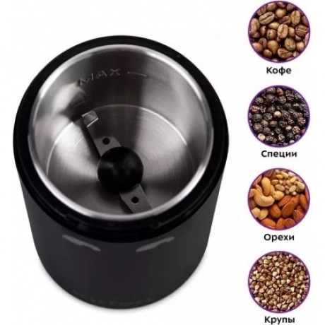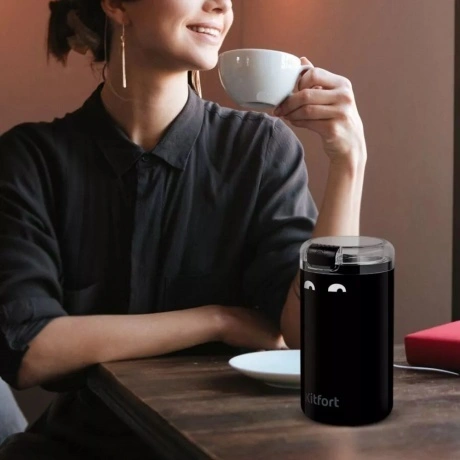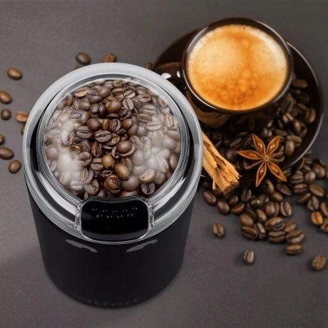 Кофемолка КТ-7116 предназначена для помола кофейных зёрен, измельчения специй и орехов. Она имеет стильный и привлекательный дизайн, благодаря чему впишется в любой интерьер. Это несложное в использовании устройство обязательно пригодится любителям кофе! В чаше установлены ножи с двумя лезвиями из нержавеющей стали для эффективного измельчения зёрен кофе и специй. Эти ножи при включении кофемолки быстро вращаются и рубят зерна. Положите зёрна в чашу до максимальной отметки и установите крышку. Кофемолка включается простым нажатием на кнопку на корпусе устройства. Защитный механизм не позволит включить кофемолку, если крышка установлена неправильно. В КТ-7116 предусмотрена прозрачная крышка для наблюдения за процессом помола. Степень помола зависит от продолжительности работы устройства. Чем дольше вы измельчаете, тем мельче будет помол. Полностью разборная конструкция позволяет легко и быстро очистить кофемолку. На дне есть специальные прорезиненные нескользящие ножки, которые придают прибору устойчивость во время работы. Кофемолка КТ-7116 в считанные секунды сделает качественный помол кофейных зёрен и поможет взбордится чашечкой ароматного кофе с самого утра. Насладитесь насыщенным запахом и вкусом домашнего свежемолотого кофе! Наша техника порадует вас не только своим функционалом, но и интересным дизайном! В любой момент вы можете отклеить креативный стикер без вреда для поверхности.