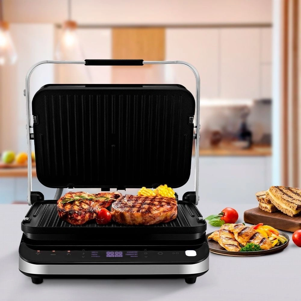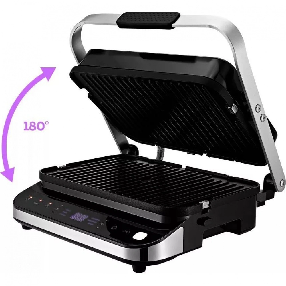Электрогриль 2 в 1 предназначен для приготовления мяса, рыбы, овощей, сосисок, бутербродов и многих других блюд. Высокая температура способствует быстрому приготовлению продуктов, а ребристая поверхность панелей появлению полосатого рисунка. Электрогриль оснащён панелями для гриля с ребристой поверхностью, с помощью которых вы можете приготовить мясо, овощи, сосиски и многое другое. Также в комплекте идут две дополнительные панели для приготовления вкуснейших домашних вафель! С помощью панели управления вы можете выбрать автоматический режим работы: мясо, рыба, курица, сосиски, гамбургер и бекон. Вы также можете вручную установить температуру нагрева до 230C. Кроме того, прибор обладает функцией разморозки продуктов. С помощью КТ-1682 вы можете готовить как в двухстороннем, так и в одностороннем режиме. В одностороннем режиме крышка гриля откидывается на 180, и гриль превращается в большую жаровню. Для приготовления можно использовать обе поверхности. Нагревательные панели изготовлены из алюминия с нанесённым антипригарным покрытием. Это позволяет использовать минимум масла в процессе готовки. Кроме того, панели съёмные и могут быть легко очищены. Весь лишний жир и сок из блюд попадёт в съёмный поддон. Просто выньте поддон и помойте его с моющим средством!