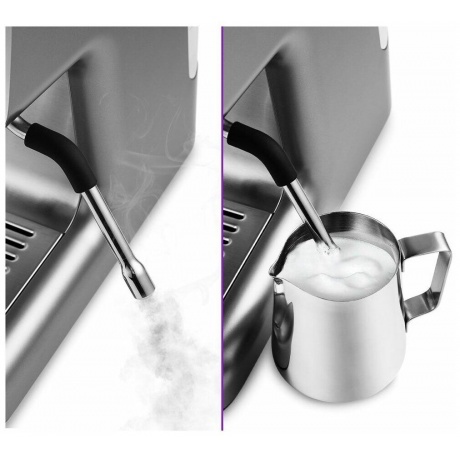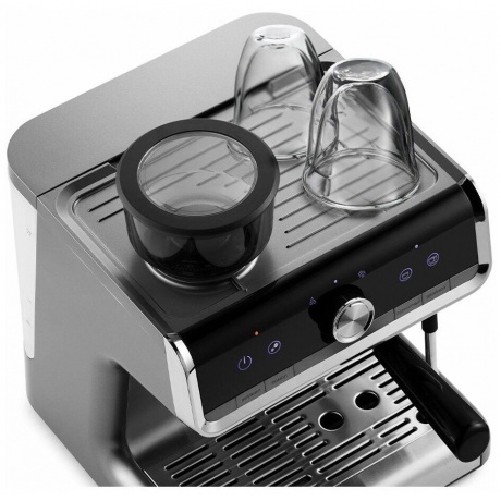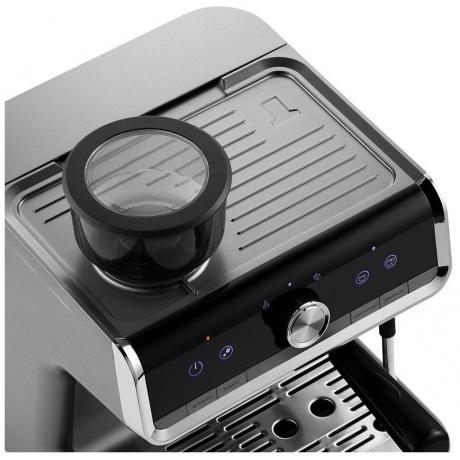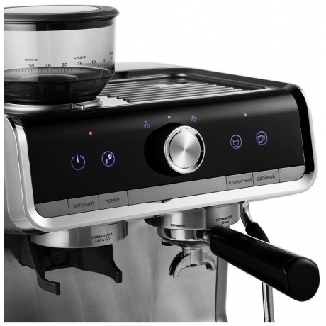 Кофеварка приготовит для вас любимый эспрессо, капучино, латте, а также множество других видов кофе. Встроенная кофемолка измельчит кофейные зёрна до нужного вам помола. Также с помощью кофейной станции вы можете подогреть паром остывший чай или молоко. Встроенная кофемолка с коническими металлическими жерновами позволяет качественно измельчать кофейные зёрна непосредственно перед приготовлением, что положительно отражается на вкусе готового напитка. Чаша ёмкостью 250 г имеет съёмную крышку. Молотый кофе помещается в фильтр рожка, прессуется в таблетку темпером, затем вода проливается сквозь кофе под давлением. Напиток получается без примеси гущи, сохраняется оригинальный вкус зёрен, большое количество полезных веществ и тонкий аромат кофе. Капучинатор в кофеварке – это паровая трубка с насадкой панарелло. Трубку погружают в холодное молоко, включают подачу пара и взбивают пенку. Также можно подогреть остывший чай или молоко. Металлический питчер с удобной ручкой и носиком идёт в комплекте. С помощью стильной панели управления вы можете выбрать одинарный или двойной эспрессо, включить подачу пара на стимере, настроить температуру заваривания кофе, запустить помол зёрен. Помимо основных функций, вы можете запрограммировать время пролива воды, подаваемое через рожок путём нажатия и удержания кнопки «Эспрессо» или «Двойной эспрессо» необходимое количество времени. Кофеварка запомнит это время при следующем приготовлении. На платформу можно ставить чашки и темпер, чтобы они были тёплыми или лучше сохли после мытья. На платформе удобно размещать чашки во время приготовления молочной пены. К моменту, когда вы закончите, чашки успеют подогреться. Резервуар для воды объёмом 2.8 л легко снимается и наполняется водой. Его легко чистить за счёт удобной формы и широко открывающейся крышки. Поддон для сбора капель со съёмной решёткой из нержавеющей стали легко снимается, моется и устанавливается обратно. Металлические фильтры с лазерным нанесением отверстий долговечны и не требуют использования каких-либо расходующихся частей. Темпер качественно утрамбовывает кофе в фильтре, а в питчере удобно взбивать молоко и художественно оформлять напитки.