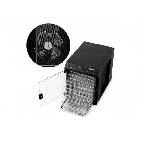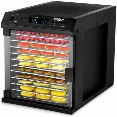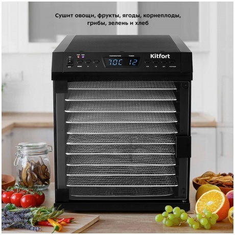 Сушилка для овощей и фруктов KITFORT КТ-1932 сохранит любимые фрукты и овощи полезными круглый год. Прибор насушит на всю зиму помидоры, кабачки, баклажаны, клубнику, абрикосы, мясо, рыбу, персики, тыкву, грибы, зелень, а также хлеб. У сушилки есть 2 режима с установленными параметрами для быстрой и медленной сушки. Режимы можно выбрать кнопкой «Выбор режима». На сушилке можно установить температуру в диапазоне от 40 до 70°C с шагом 10 градусов и время до 48 часов с шагом 1 минута. Сушилка имеет в комплекте 10 поддонов из металлической сетки и 1 сплошной поддон для пастилы. Вы сможете засушить любимые фрукты, овощи, хлеб или мясо полностью безопасно. В сушилке установлен мощный нагревательный элемент и вентилятор с лопастями большого диаметра, обеспечивающий равномерное распределение нагретого воздуха по всему объему камеры. Благодаря горизонтальному обдуву продукты сушатся равномерно.