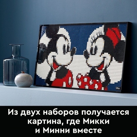 Пригласите к себе домой звезд мультфильмов! Погрузитесь в сборку и создайте один из двух портретов ваших любимых персонажей Диснея: Микки Мауса или Минни Маус. Если вы купите два набора, то сможете собрать объединенный портрет с двумя героями — каждый на на уникальном фоне. Аудиозапись, дополняющая набор, улучшит впечатления от сборки и позволит еще глубже погрузиться в этот набор. Закончив сборку, добавьте табличку с подписью Диснея и выставьте результат на всеобщее обозрение! Покажите свою любовь к Микки и Минни Маус с этим потрясающим набором-мозаикой LEGO Art «Disney’s Mickey Mouse» (31202). Собрав портрет, повесьте его на стену или поставьте на полку. Насладитесь отдыхом с этим набором LEGO из более чем 2650 элементов — включая 9 декоративных настенных пластин, табличку с подписью Диснея, раму из кубиков LEGO, уникальный подвесной элемент и инструмент для извлечения плиток. Этот набор позволяет расслабиться и восстановить энергию, выражая любовь к Микки Маусу через искусство. Слушая во время сборки подкаст, вы сможете узнать новые интересные подробности. Чтобы вывести творчество на новый уровень, приобретайте и объединяйте два набора, и у вас получится единая картина с Микки Маусом и Минни Маус Диснея на уникальном фоне. Размеры портрета: квадрат стороной более 40 см. Набор предлагает два варианта сборки и станет отличным подарком для вас или другого поклонника Disney, любящего работать руками. Красочное высококачественное руководство по сборке проведет вас через весь проект, предлагая план, снимающий стресс через искусство, и вдохновленные LEGO способы расслабиться. Наборы LEGO Art будут прекрасно смотреться на стене или на полке и дарят таким, как вы, взрослым восхитительные впечатления от сборки и возможность уделить время своему увлечению искусством и творчеством. Все элементы LEGO, произведённые с 1958 года, соответствуют самым строгим отраслевым стандартам, поэтому они совершенно безопасны, совместимы друг с другом и надежно соединяются и разъединяются. Все элементы LEGO испытывают на падения, сжатие, скручивание, нагревание, растяжение, царапины и изгиб, так что настенная мозаика «Disney’s Mickey Mouse» полностью соответствует строгим международным стандартам безопасности.