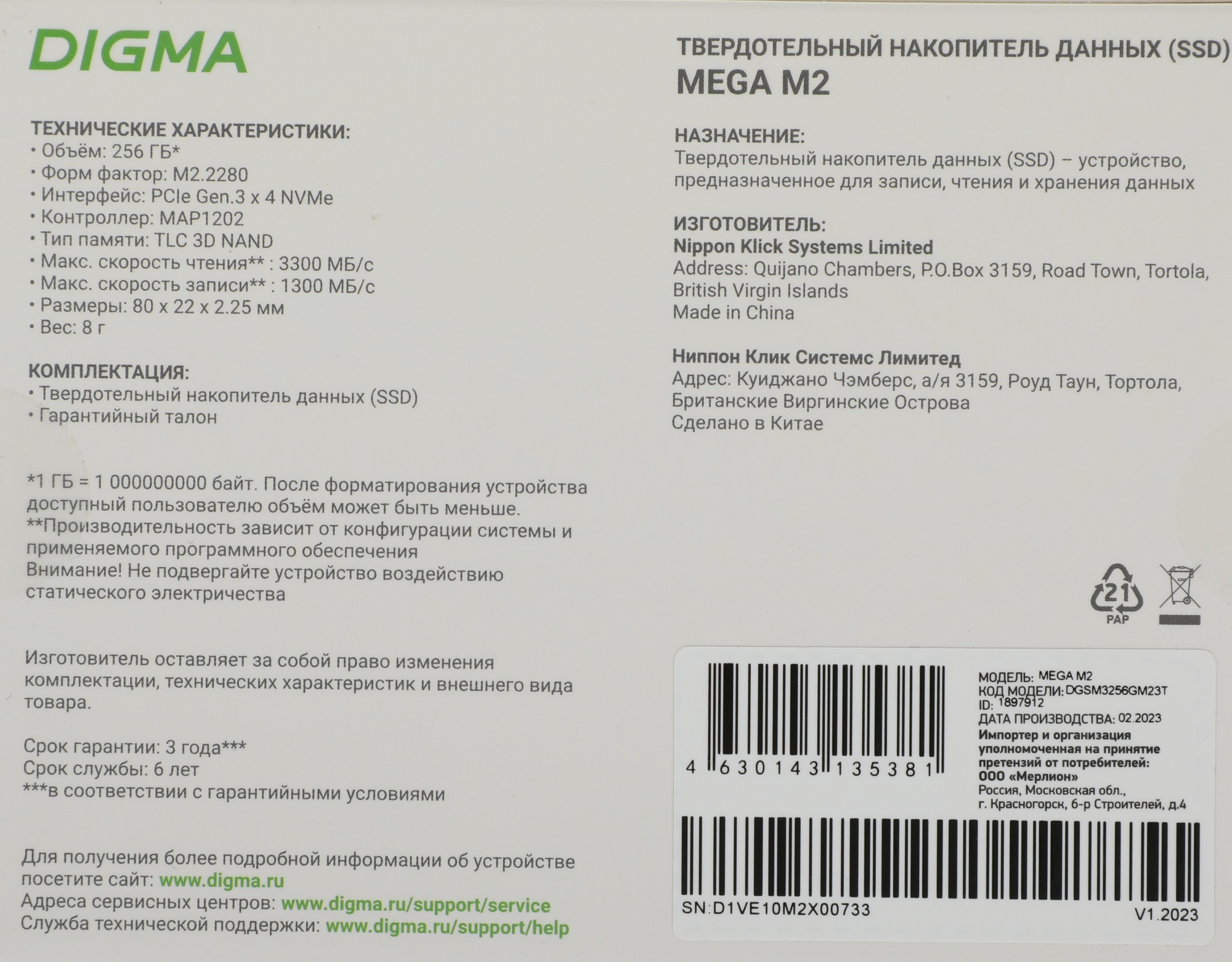Описание товара Накопитель SSD Digma 512Gb Mega M2 M.2 2280