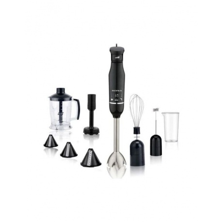 блендер, съемная насадка-блендер из нержавеющей стали, съемная насадка-венчик из нержавеющей стали, венчик для взбивания молочной пенки, измельчитель с конусными насадками 1,25 л., насадка для картофельного пюре, мерный стакан с крышкой 600 мл., инструкция на русском языке, гарантийный талон